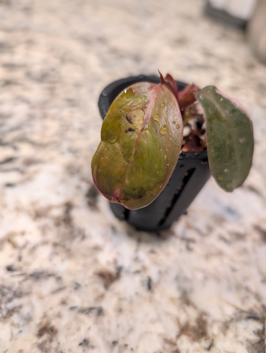Heute ist mir aufgefallen, dass das gleiche Problem auf dem verbleibenden Blatt (zweites Bild) aufgetreten ist, das wie das Ende der Pflanze aussieht. Das Seltsame ist, dass die Pflanze gerade erst damit begonnen hat, seit Erhalt der Pflanze ihre ersten Blattstiele auszusenden, es scheint also, dass sie trotz dieses Problems zu wachsen scheint.