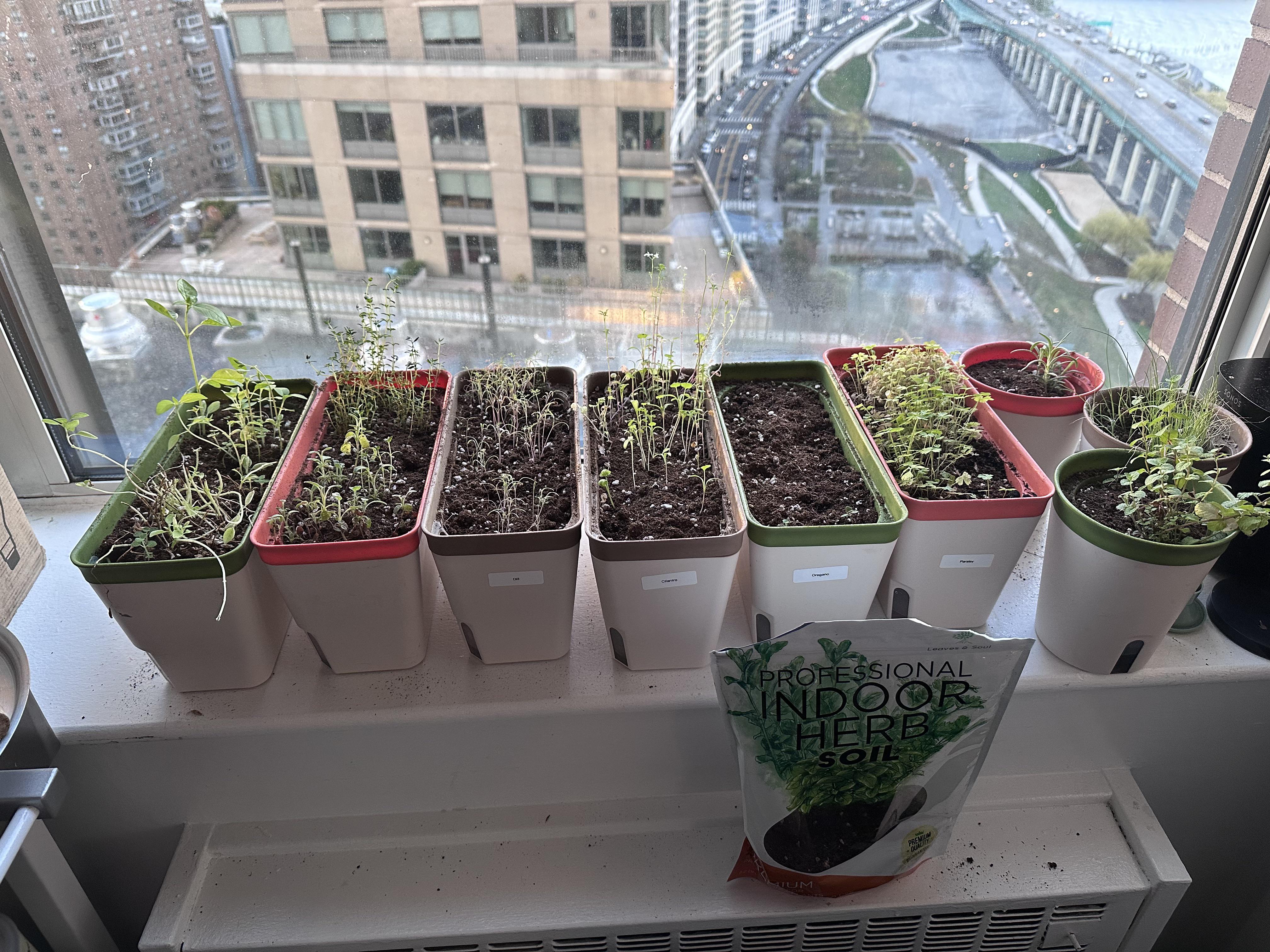 An einem nach Süden ausgerichteten Fenster mit wenigen Hindernissen. Alle sind selbstbewässernde Töpfe, und ich halte den Behälter voll. Ich habe angefangen, alle paar Tage mit Nebel zu sprühen. Meine anfänglichen Fehler bestanden darin, normale Blumenerde zu verwenden und die Erde nicht bis zum Rand aufzufüllen. Seitdem das behoben wurde, wachsen Basilikum, Thymian, Salbei und Minze prächtig. Oregano fängt auch an, reinzukommen, aber ich weiß, dass es eine Weile dauern wird.