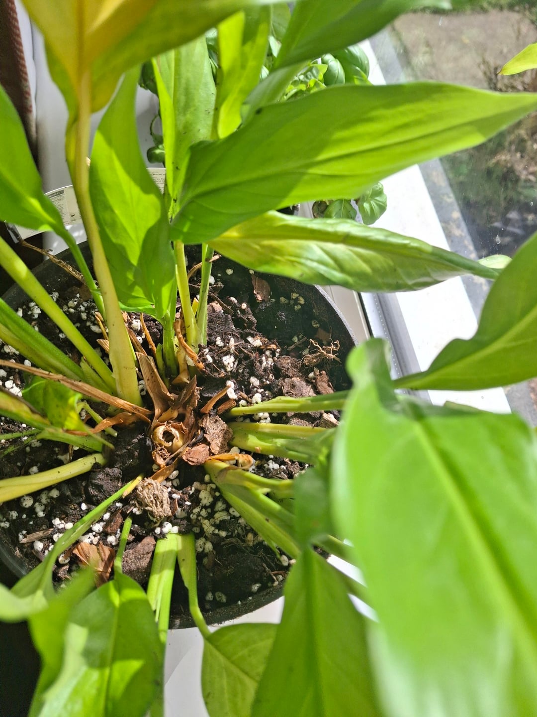 Deshalb habe ich kürzlich über die Friedenslilie meines Partners gepostet, sie brauchte dringend einen Schnitt und neuen Boden. Ich habe etwas Erde besorgt, Rindenmulch, und ich habe sogar einen Teil meiner Erde aus meinem Haus geworfen, weil die Samen nicht aufgingen, sodass die Erde eine Weile ruhte, das und etwas zusätzliches Perlit, was eine ziemlich klobige Erdmischung ergibt, und ich habe sie gestern Abend umgetopft, die Wurzeln sind alle sehr gesund und weiß, habe dabei kaum eine einzige verloren, und heute Morgen sieht sie ziemlich gut aus, ich habe sie sogar näher ans Fenster gestellt, um besseres Licht zu bekommen. Mir ist aufgefallen, dass es sich möglicherweise nicht mehr um eine einzelne Pflanze handelt. In der Mitte befindet sich eine große, sehr tote Krone. Ich denke, dass die Mutterpflanze vielleicht abgestorben ist, um neue Ableger zum Leben zu erwecken, aber ich weiß nichts über Friedenslilien, also rate ich nur, basierend auf meinem Allgemeinwissen