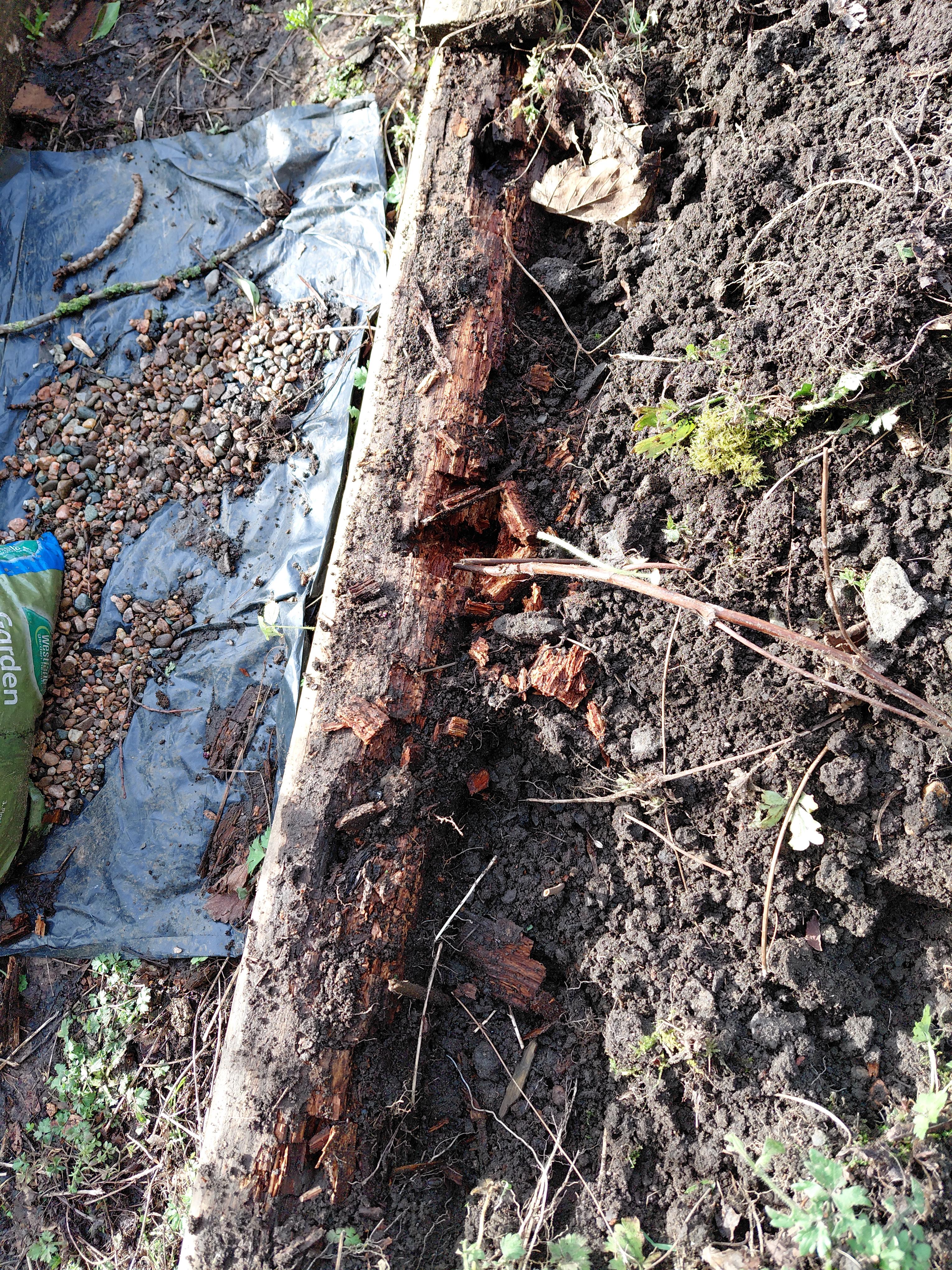 Ich habe vor Kurzem ein Hochbeet-Kleingartengrundstück erworben. Es muss eine ganze Weile verlassen bzw. schlecht gewartet worden sein, denn als ich heute mit dem Aufgabeln begann, stellte ich fest, dass ein großer Teil des Holzes stark verrottet war.