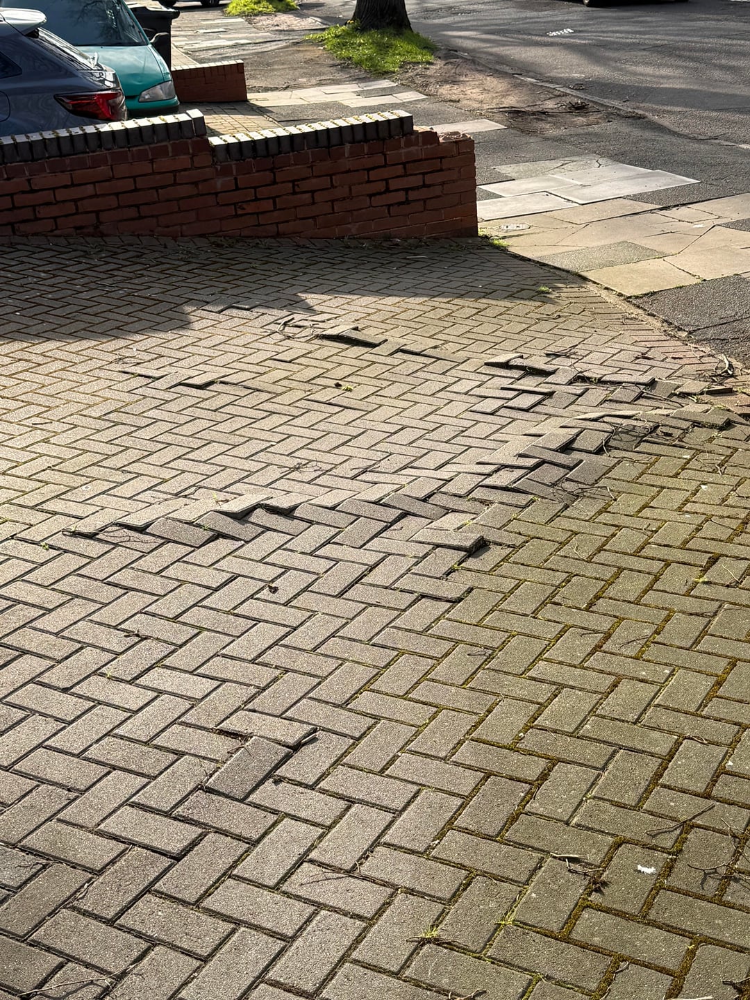 Wie Sie auf dem Foto sehen können, haben sich die Wurzeln in meiner Auffahrt ziemlich stark nach oben gedrückt – einige der Pflastersteine sind jetzt uneben und heben sich, und das wird mit der Zeit immer schlimmer. Es wird langsam zu einer Stolperfalle und ich befürchte, dass es auch zu Schäden an meinem Auto führen könnte.
