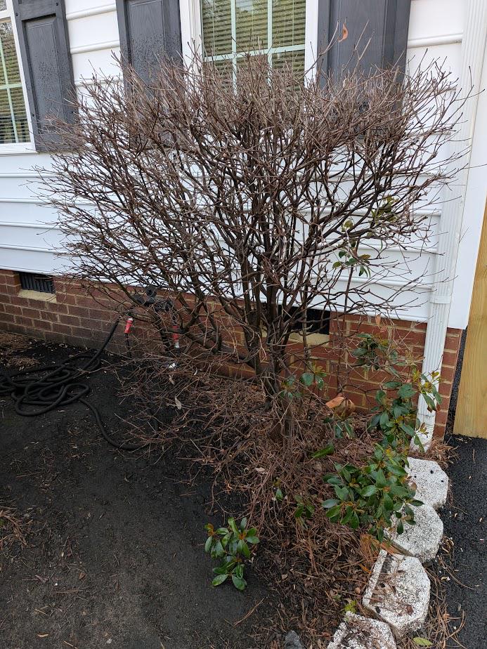 Dies ist ein Update für dieser Beitrag Ich habe hier letzten Herbst einen Busch in meinem Garten gesehen, der ausgetrocknet zu sein scheint. Der Rat, der mir damals gegeben wurde, war, bis zum Frühjahr zu warten und zu sehen, ob es wieder kommen würde. Nun, der Frühling ist da und fast alles in meinem Garten hat zu blühen begonnen, außer diesem Busch. Sogar die wenigen lebenden Äste zeigen Aktivität, während der Rest so trocken ist wie immer. (Es sieht jetzt nass aus, weil ich gerade versucht habe, es zu gießen). Was ist also der nächste Schritt? Beschneiden? Wie viel? Sollte ich es bis auf die Wurzeln abschneiden und es einfach noch einmal versuchen?