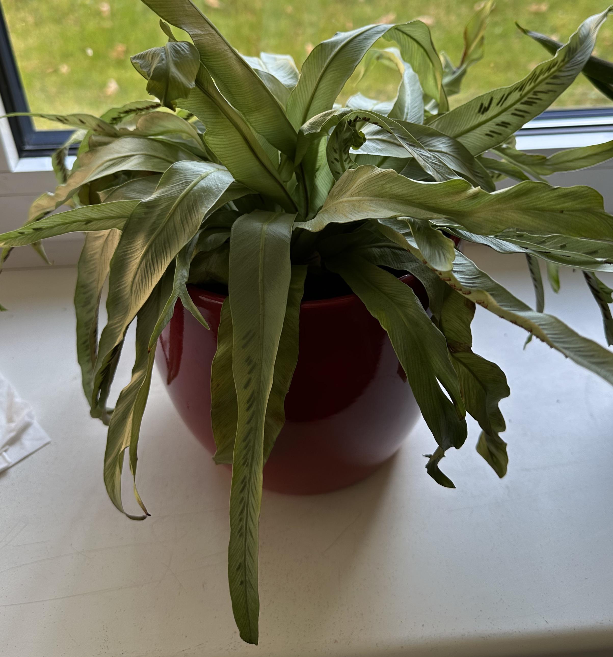Aufgrund meiner Abwesenheit musste mein Hirschzungenfarn im Büro 5 Wochen ohne Wasser auskommen, da meine Kollegen leider meine Pflanzen nicht gegossen haben 🫠 Alle anderen Pflanzen sind zum Glück nach dem gestrigen geißen (mit nur kleinen Blattverlusten) wiedergekommen.