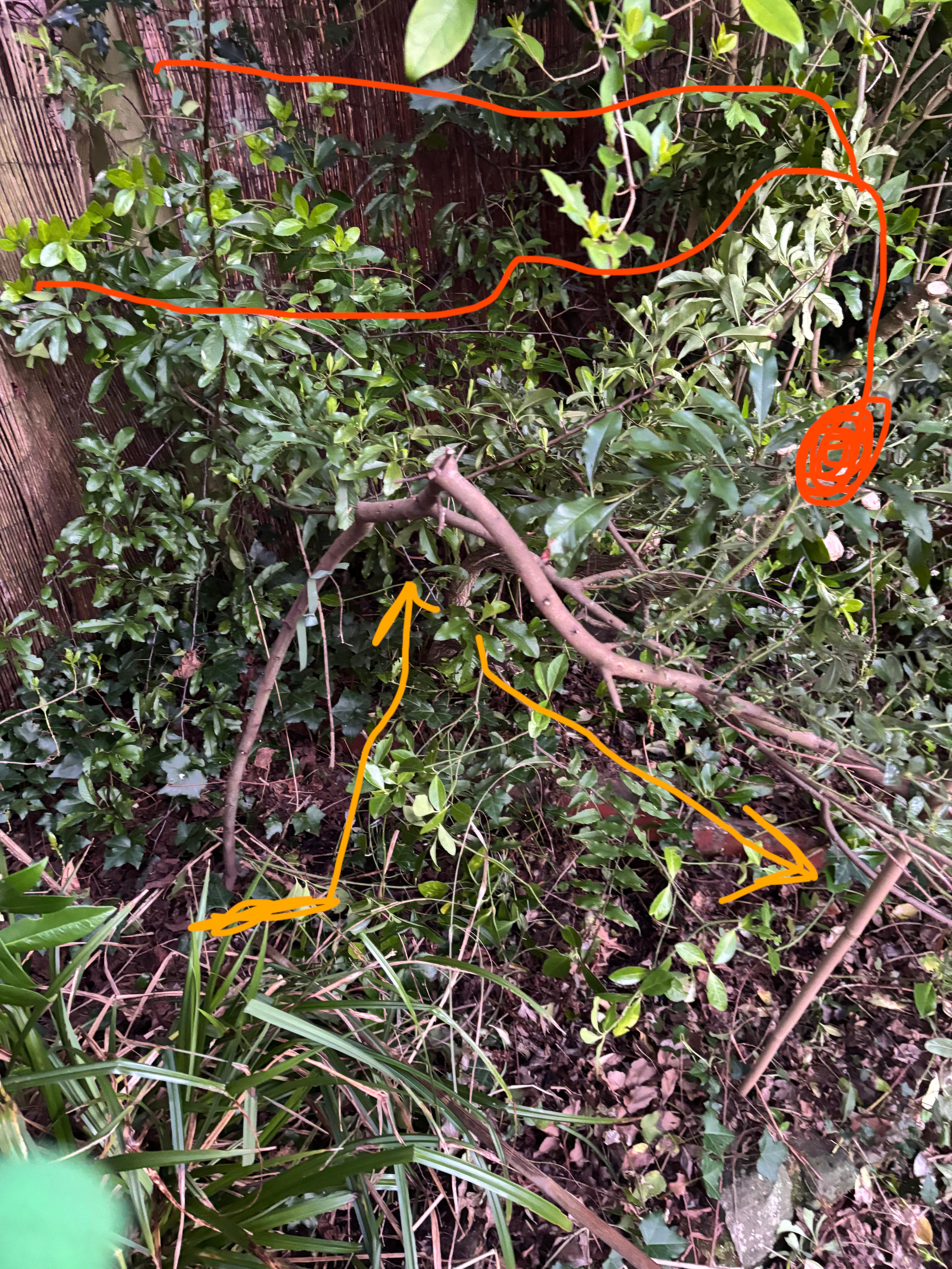Wir haben auch etwas, das wie ein Weißdorn (Feuerdorn?) aussieht, der ungefähr rot markiert ist und als etwas wächst, das man nur als Ranke entlang des hinteren Zauns bezeichnen kann … es handelt sich im Grunde genommen um Zweige mit ein paar Blättern