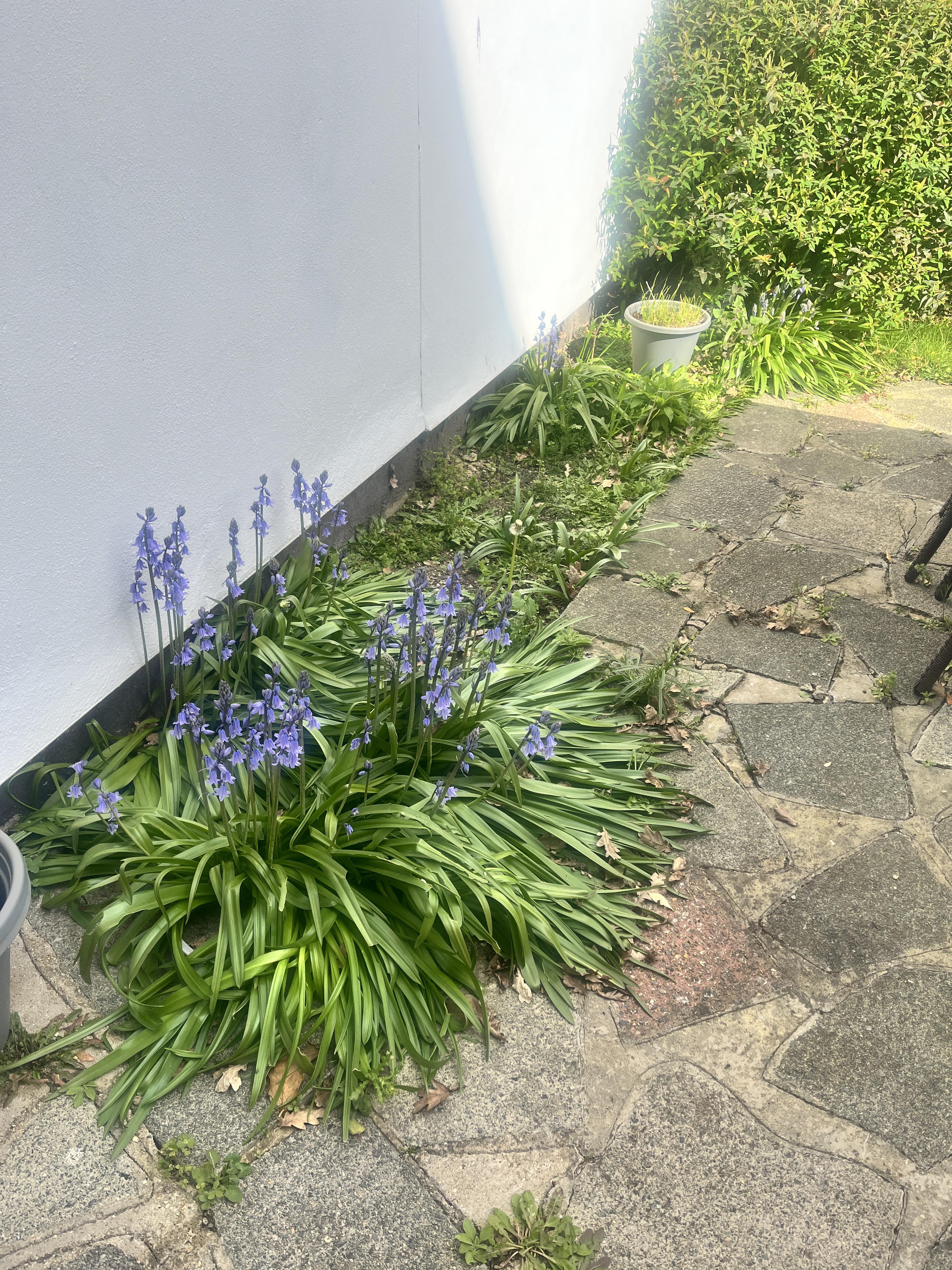 Das sind die ersten Pflanzen, die durchkommen, sie haben vor etwa einer Woche geblüht. Ich glaube, es sind spanische Glockenblumen (bitte korrigieren Sie mich, wenn ich falsch liege).
