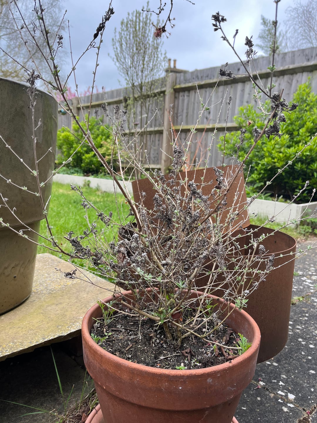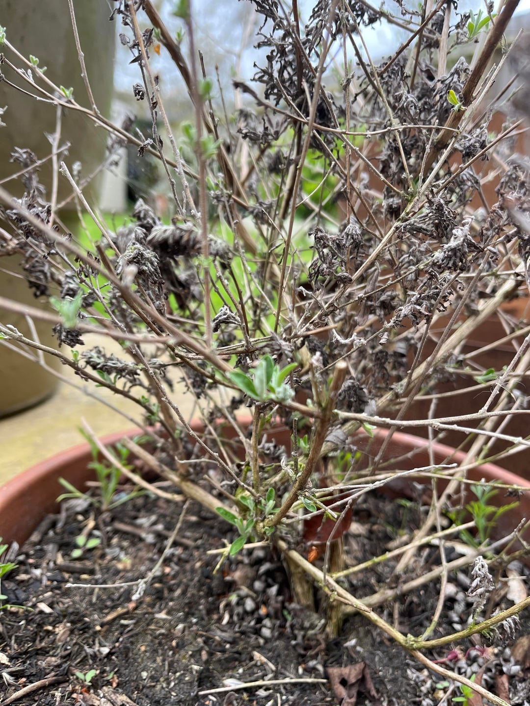 Wie soll ich diesen Sommerflieder beschneiden und pflegen? Ich kann mich nicht an die Sorte erinnern. Ich habe es letzten Sommer gekauft und denke, es ist wahrscheinlich eine kleine Sorte wie Blue Chip. Ich hatte noch nie einen Sommerflieder. Irgendwann wird es in die Erde gepflanzt, aber wir erneuern ein Beet, damit es noch ein paar Wochen/Monate in seinem Topf bleibt. Es gibt neues Wachstum, aber viel altes Holz.