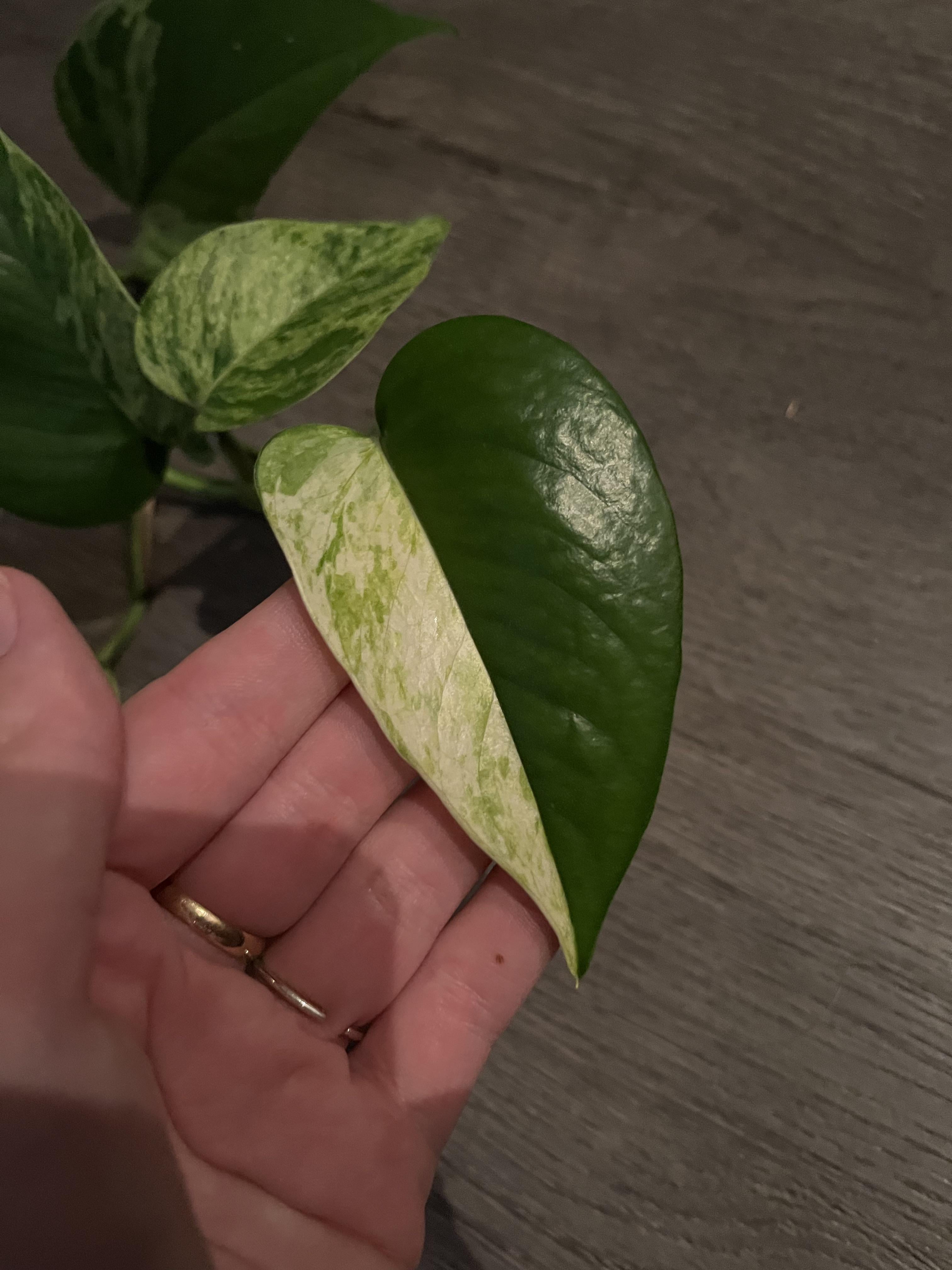 Blatt auf meinem Pothos, dessen Buntheit in der Mitte perfekt aufgeteilt ist