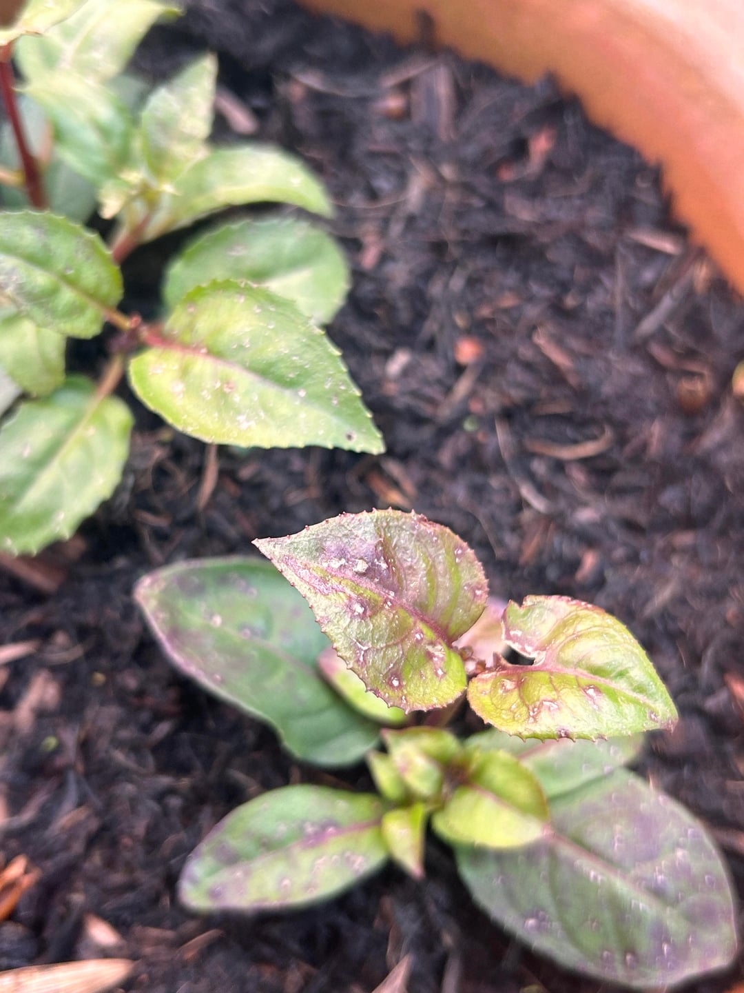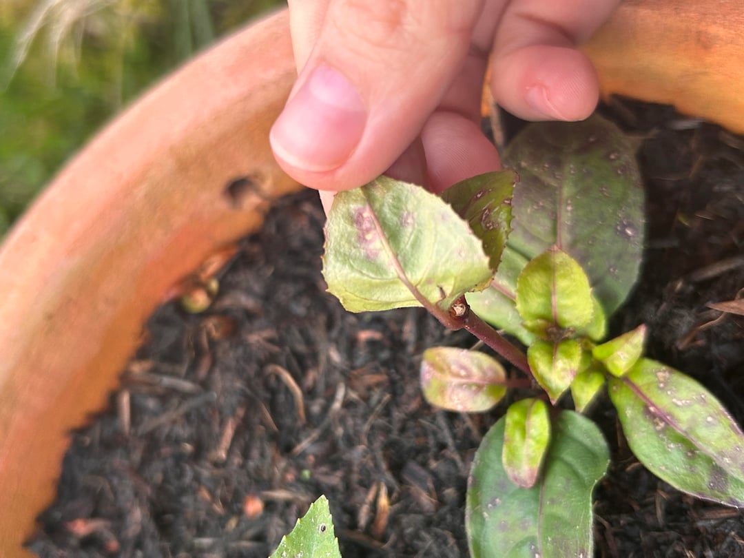 Allen Pflanzen im Garten geht es gut, nur diese kleinen Fuchsien sehen krank aus … es sind zwei Pflanzen im Topf und sie haben die gleichen Flecken auf den Blättern. Kann mir jemand helfen herauszufinden, was das sein kann? Es gibt keine Fehler