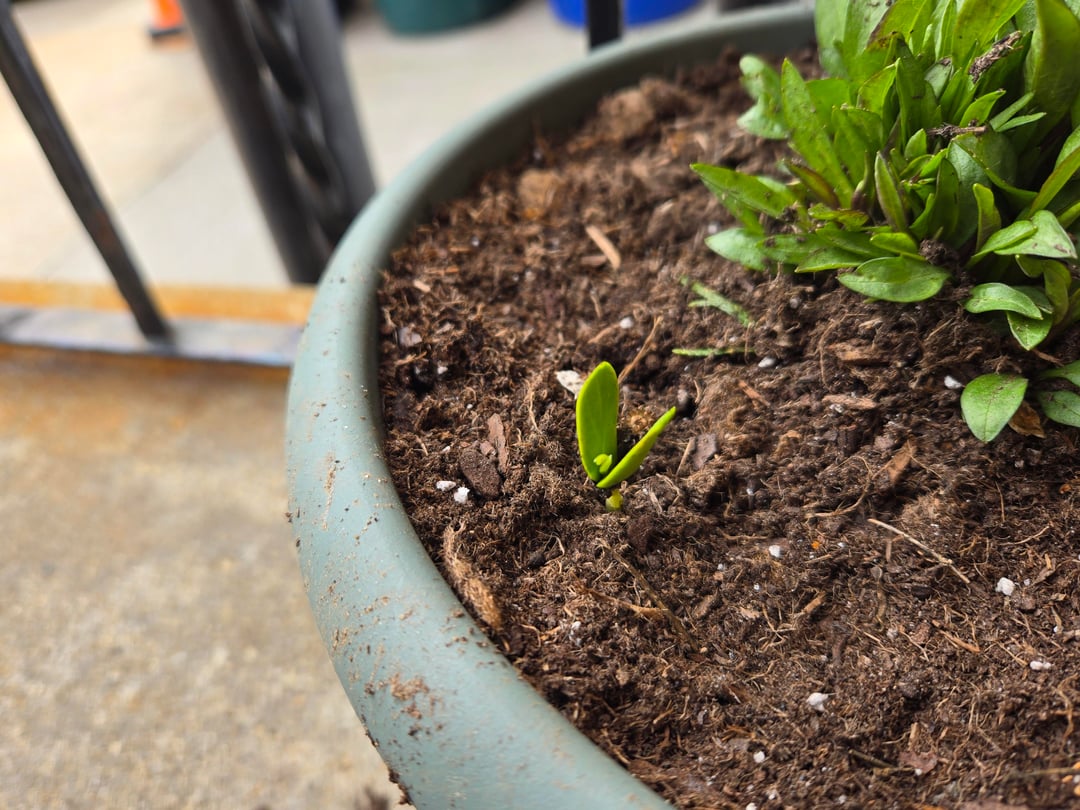 Ich habe auch ein befreundetes Eichhörnchen (sein Name ist Fat Albert, weil er ein Husky ist), dem ich jeden Tag eine Handvoll Erdnüsse gebe, und wir sind Freunde geworden. Letztes Jahr hat er die ganze Zeit in diesem Topf gegraben, und diesen Frühling sprießt in meiner Aster nun ein mysteriöser Spross!!