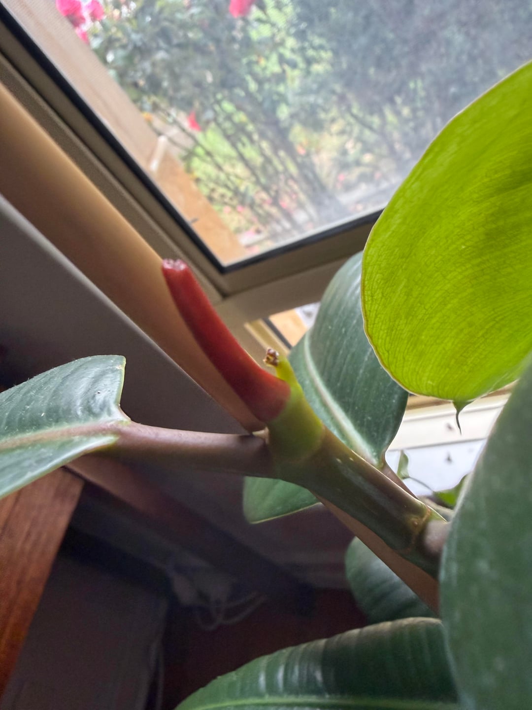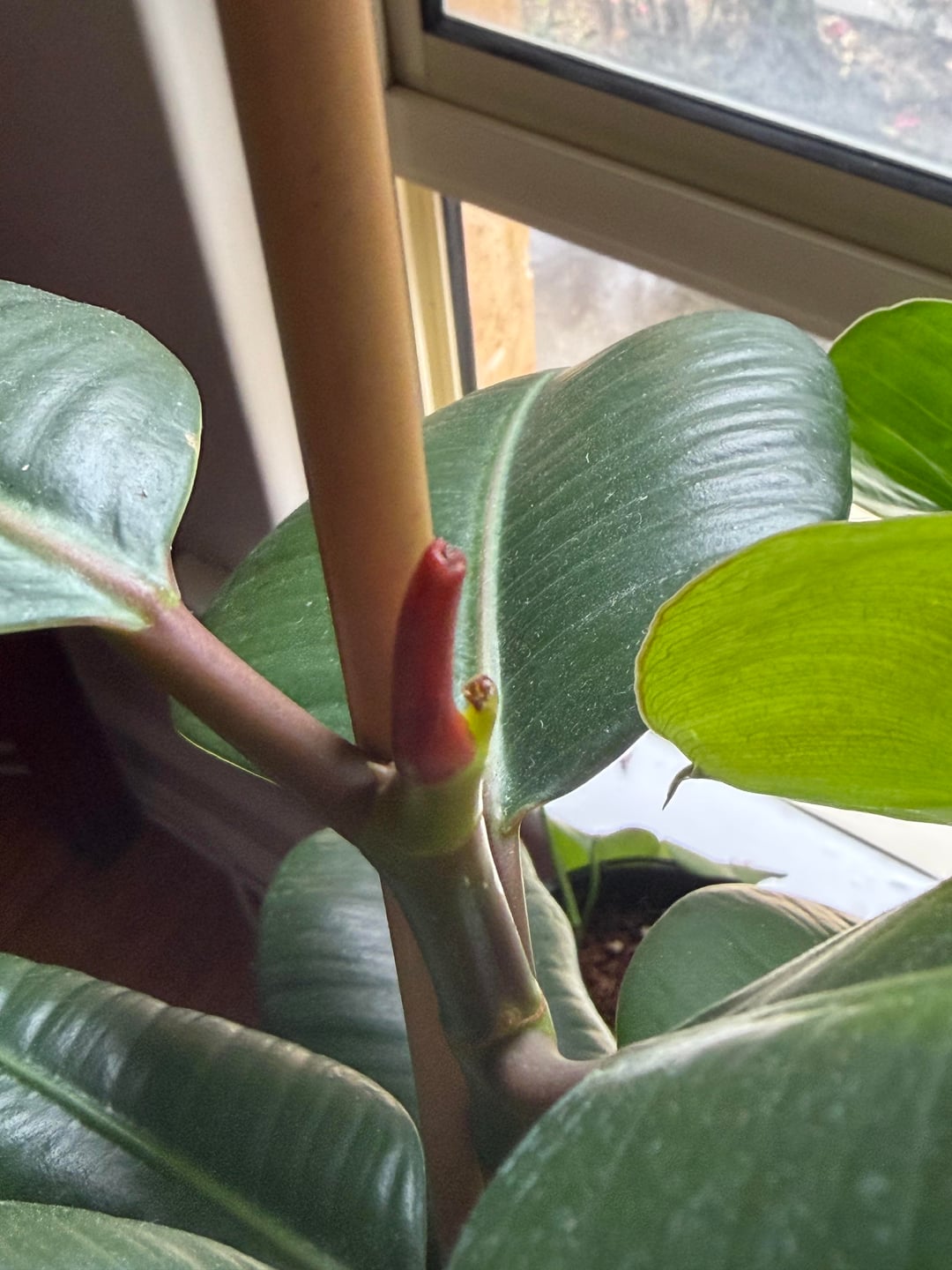 Ich habe den oberen Teil dieses Ficus abgeschnitten, um die Verzweigung zu fördern, aber es scheint, dass ein neues Blatt zu wachsen versucht? Wird der grüne Teil, der herausragt, ein Ast sein? Was ist das kleine spitze weiße Stück? Entschuldigung, ich weiß nicht viel über Ficus-Pflanzen 🙂