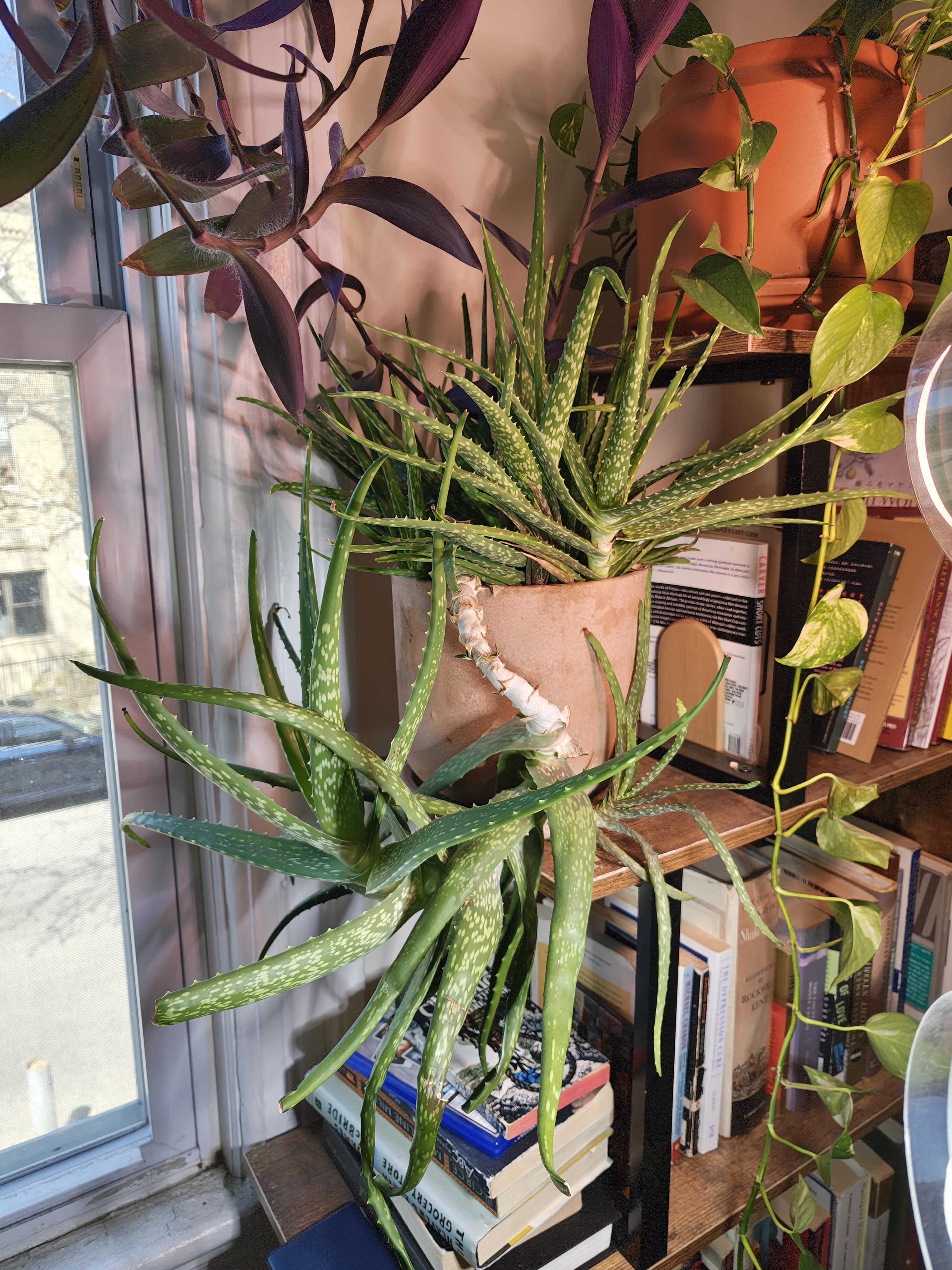 Ich bin vor ein paar Jahren umgezogen und diese Aloe-Pflanze gedieh von einem großen, nach Süden ausgerichteten Erkerfenster zu diesem Sims neben einem viel kleineren, nach Norden ausgerichteten Fenster.