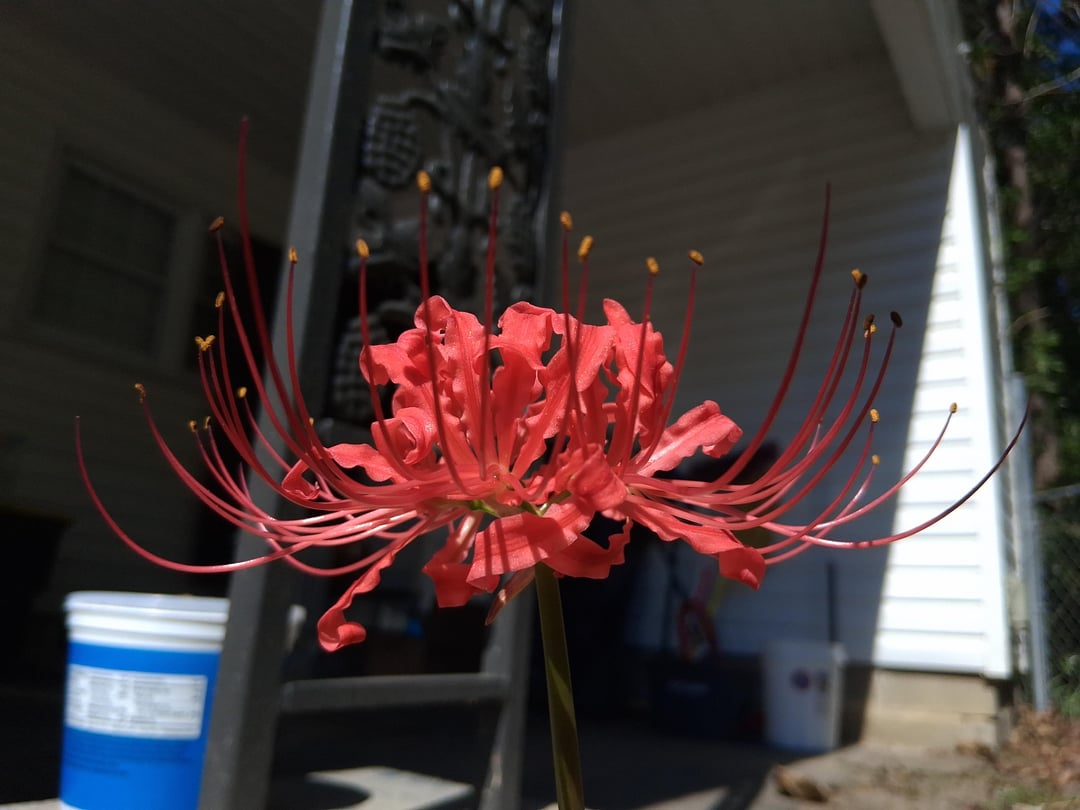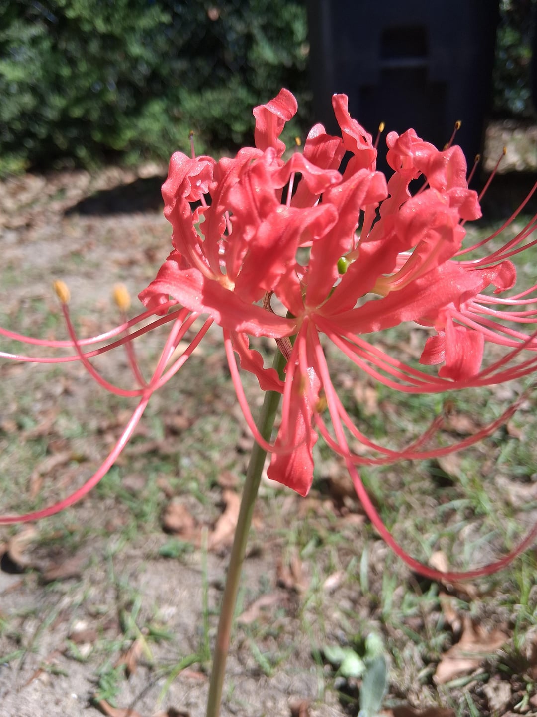 Hallo, ich glaube, ich habe hier eine rote Spinnenlilienpflanze. Ich habe es im November blühen sehen. Ich war neugierig und habe danach gesucht. Ich sagte, ich solle es nicht im Herbst graben, aber im Frühjahr ist es in Ordnung. und ich habe es bis heute vergessen.