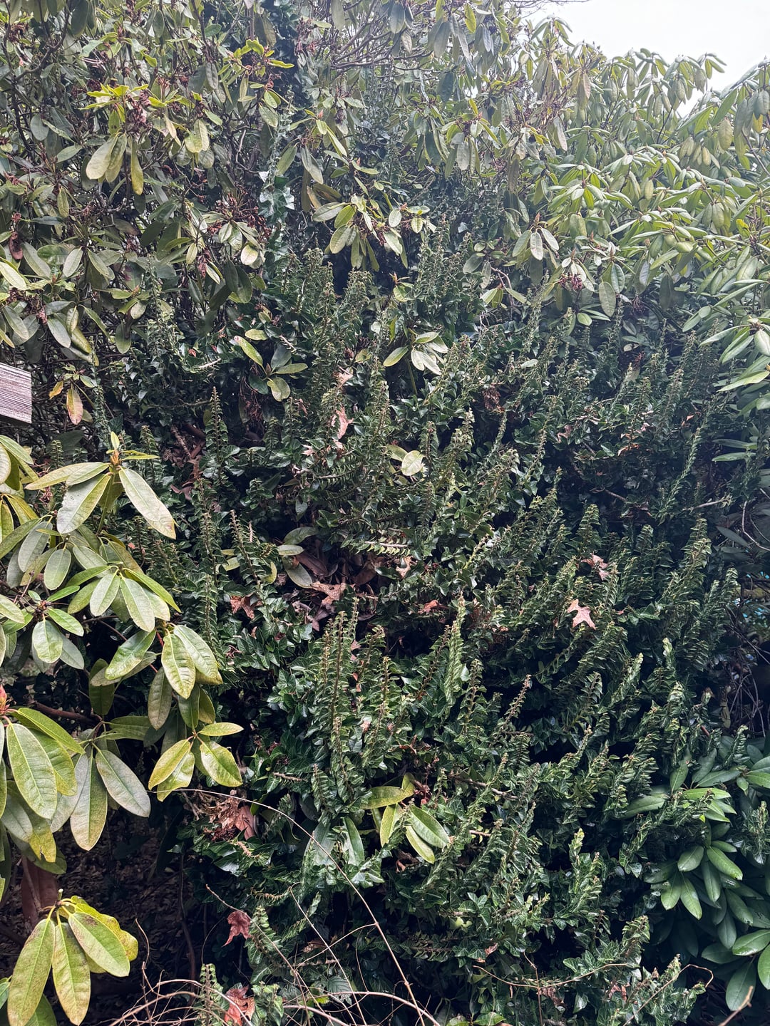 Es tut mir leid, wenn die Bilder überhaupt verwirrend sind. Es wächst eng mit einer Rhodie zusammen, das sind also die ovalen Blätter.