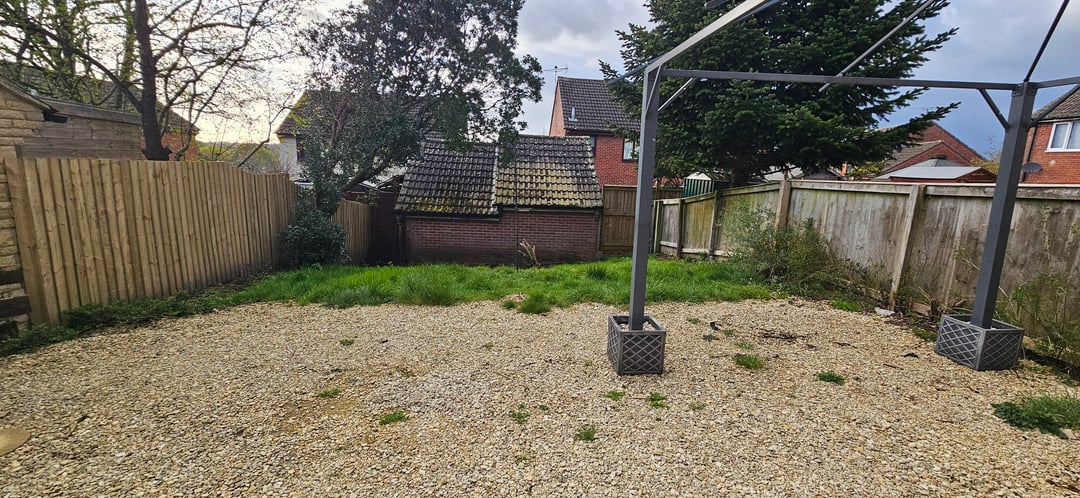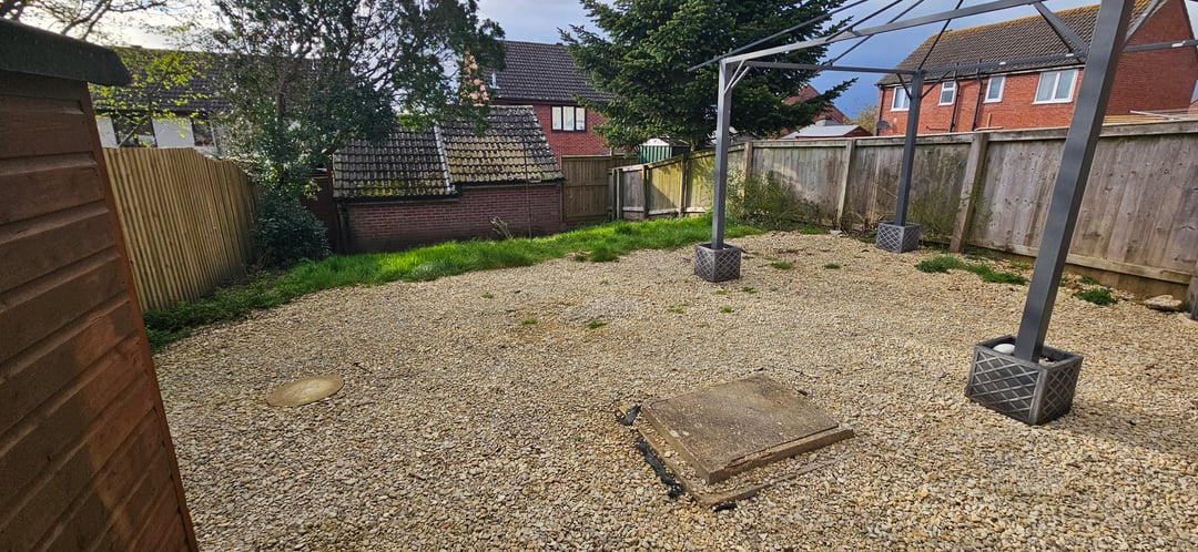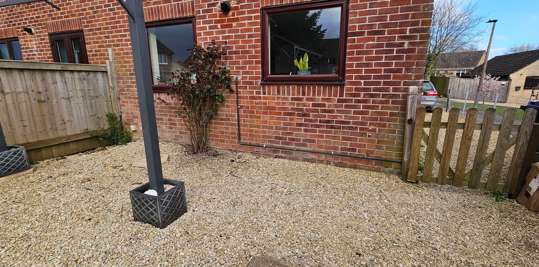 Unsere wunderbaren Nachbarn haben uns ihren alten Pavillon geschenkt, aber das ist alles, was wir derzeit haben, und ich würde diesem Garten gerne etwas Charakter verleihen, ihn aufräumen, da die Grenze zwischen Kies und Gras ein wenig unordentlich ist und es meiner Meinung nach an Struktur mangelt, und ihn so schön aussehen lassen, wie er es verdient.