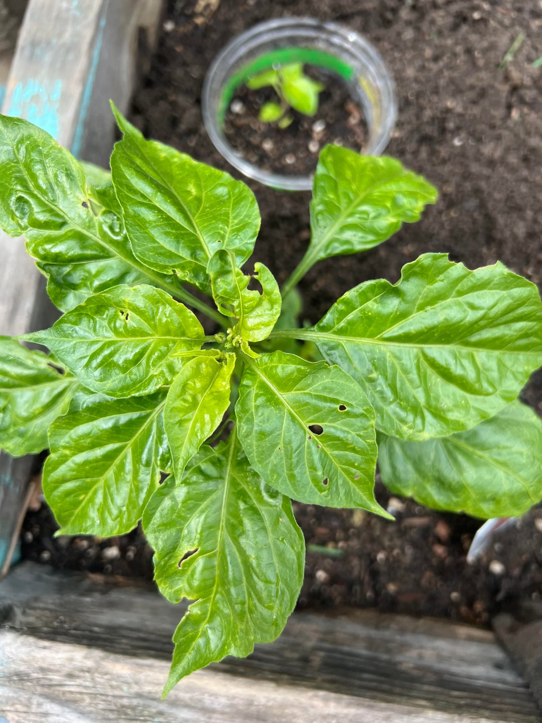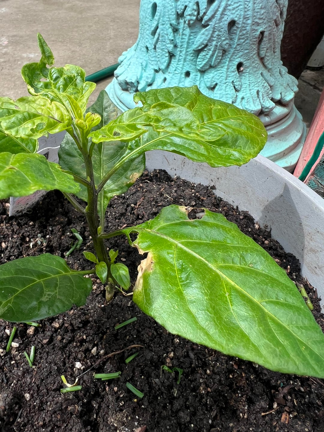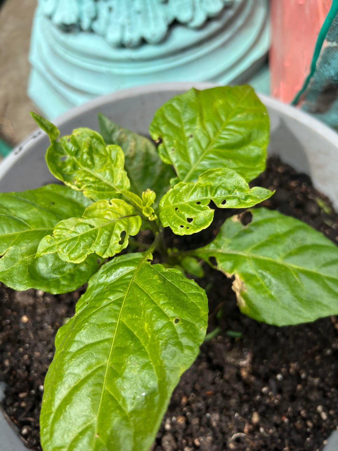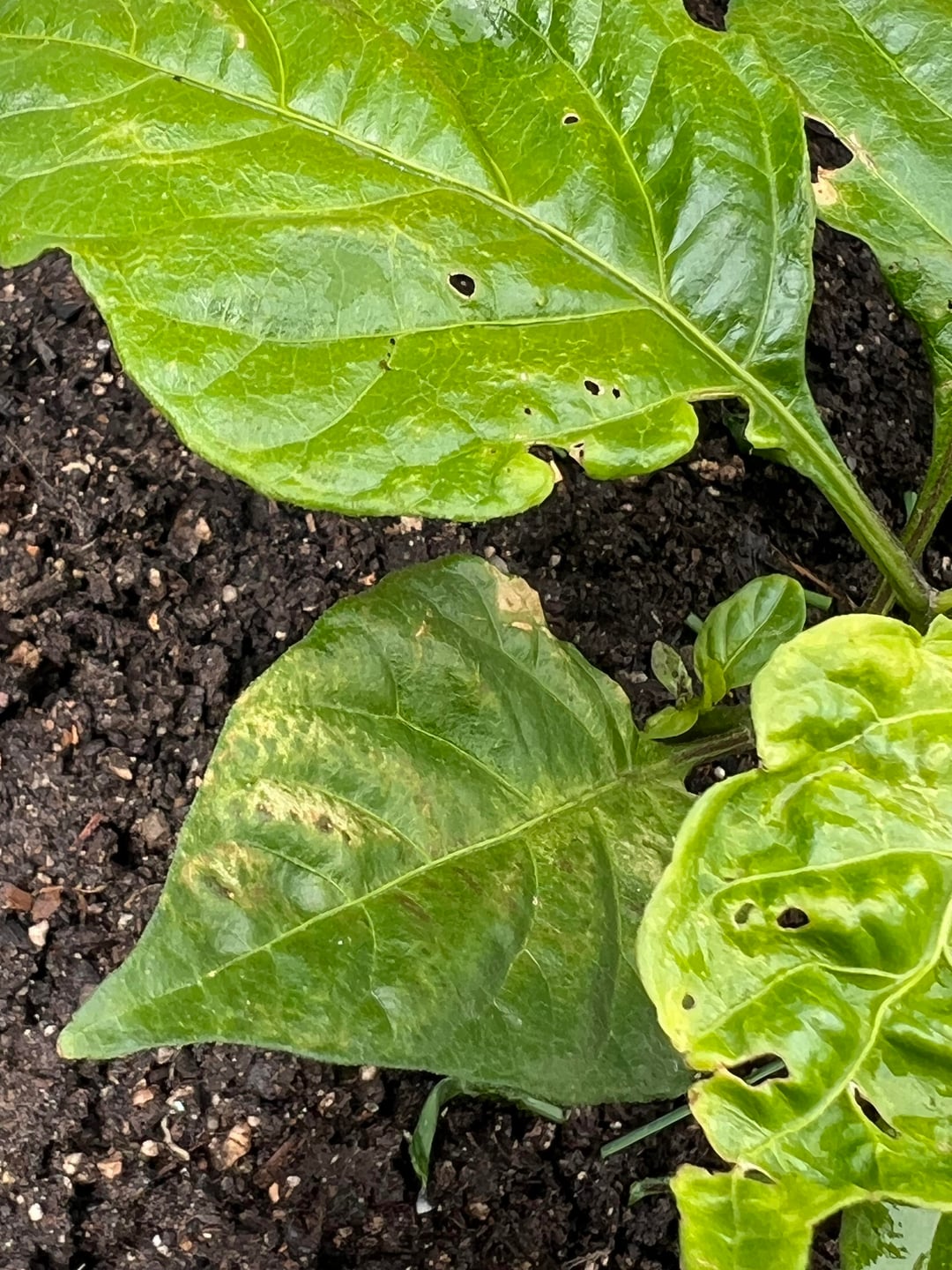 Was ist los? Ich habe zwei scharfe Pfefferpflanzen, die anfangen, Löcher zu bekommen und sich zu verfärben. In den letzten zwei Tagen hat es ab und zu geregnet, aber anderen Pflanzen geht es gut. Vielen Dank euch allen 🙏