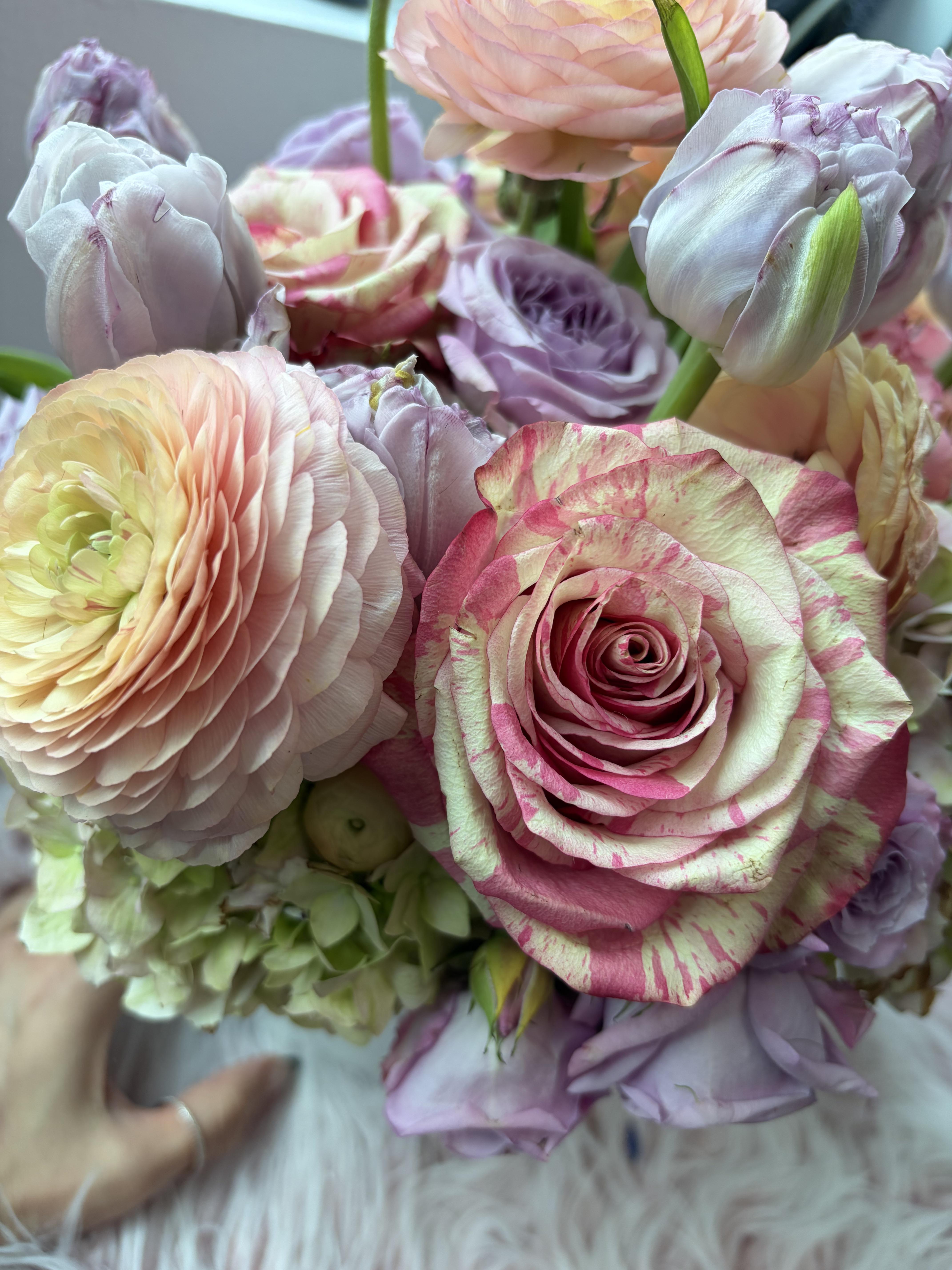 Gestreifte Rose mit Ranunkel in einem hübschen Osterstrauß
