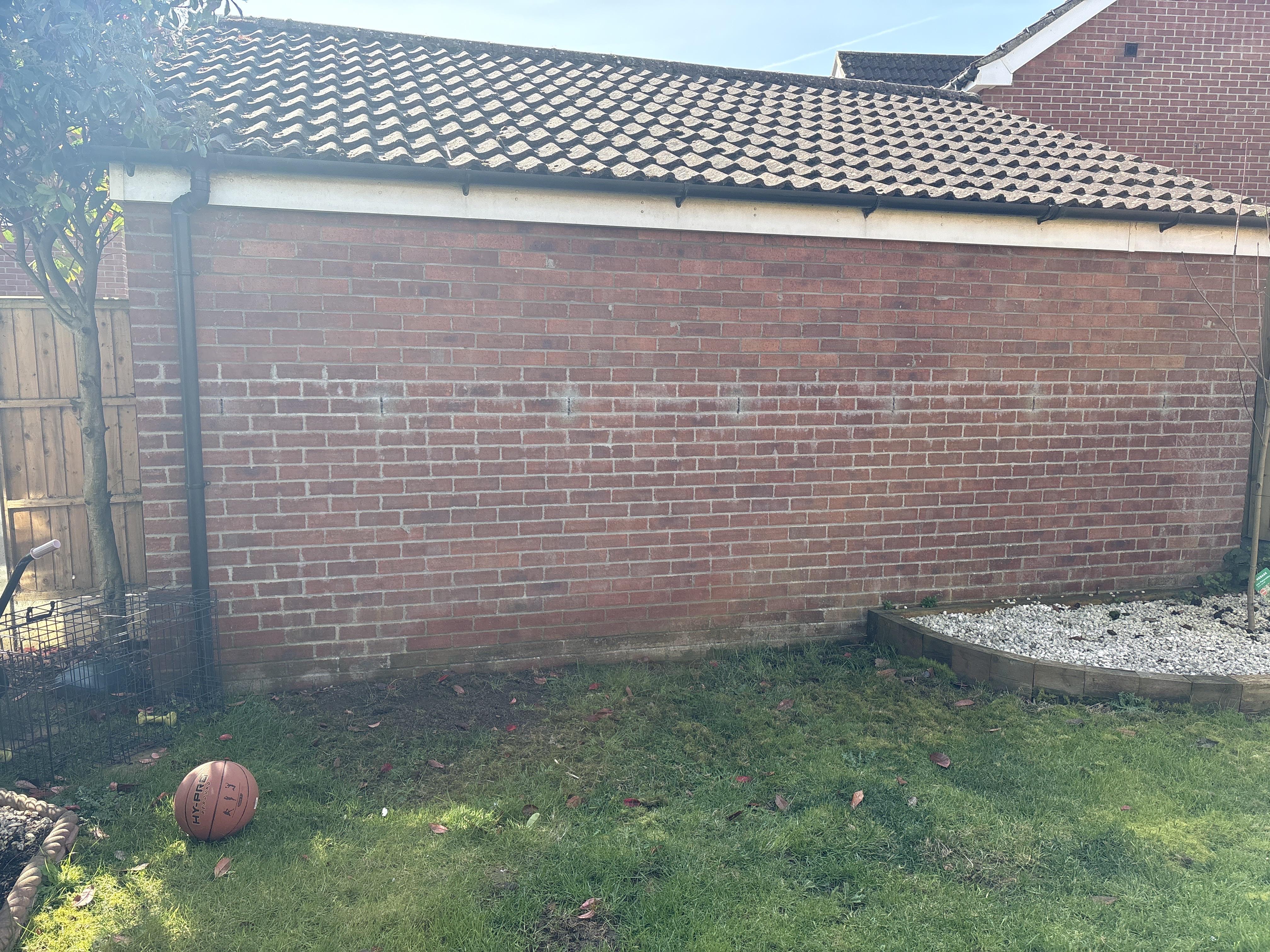 Dieser Bereich bekommt kaum Sonne ab, da sich auf der linken Seite (in der Nähe des Balls) unser Wintergarten befindet und der Garten nach Südwesten ausgerichtet ist, so dass morgens ein Hauch Sonne von vorne kommt und etwas, wenn die Sonne aufgeht. Das Gras wächst dort kaum, es ist so schattig und besteht größtenteils aus Moos; so ein Schandfleck