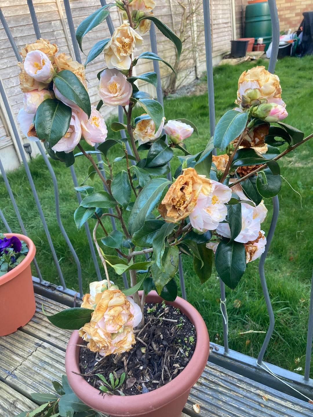 Quite common with Camellia, usually caused by the blooms getting wet or frosted followed by the sun hitting them. Try and put it in a more sheltered spot if you can