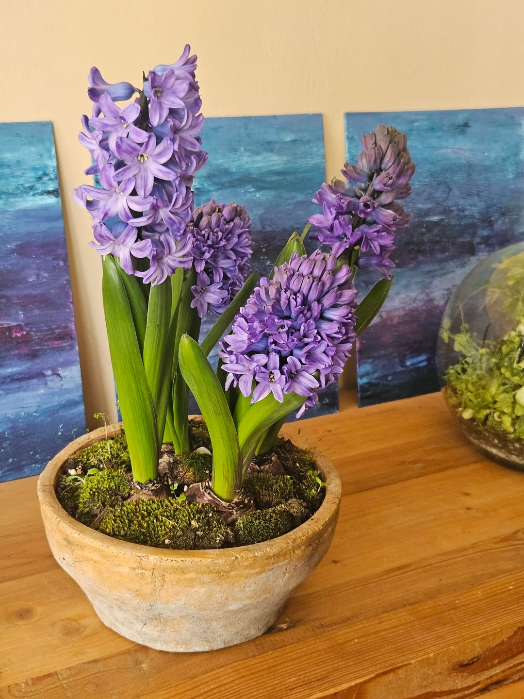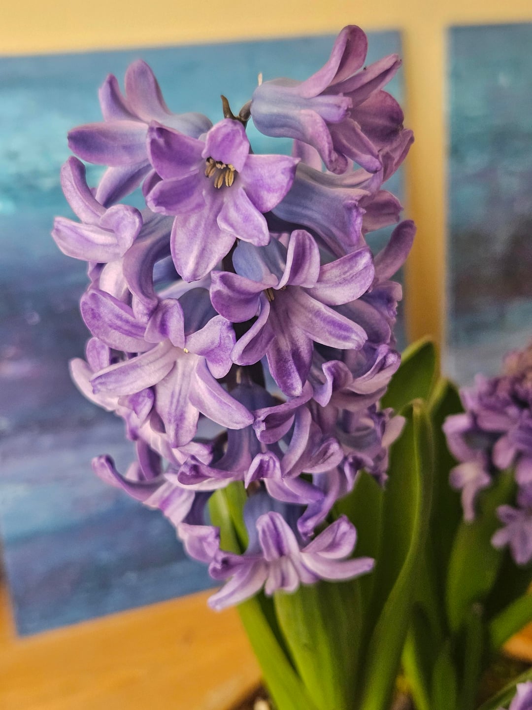 RelationshipQuiet609 on 02.04.2026 3:32 PM Your Hyacinth 🪻 🪻🪻is Beautiful-That color is gorgeous 💜💜💜! I love your paintings in the background, they make the perfect backdrop! 💜💜💜