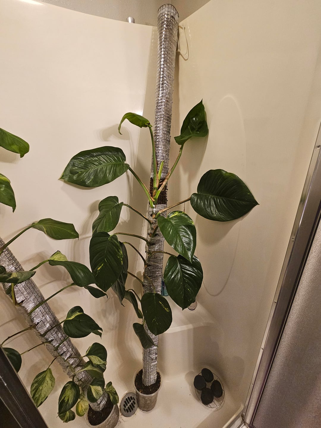 Mittlerweile habe ich über 200 Pflanzen. Meistens wertvoller als ein paar Pothos, aber diese beiden waren die ersten Pflanzen, die ich am Leben gehalten habe. Ich habe so viele Pothos getötet, bevor ich angefangen habe, Moosstangen zu machen. Jetzt kann ich sie eintopfen, aufhängen, mit Moos bestücken, vermehren und alles, außer diese begannen als einzelne kleine Ranken mit jeweils drei Blättern. Jetzt brauche ich Hilfe, um sie für ihren Spa-Wochenendtag unter die Dusche zu bringen. Wir kämpfen mit einer Reihe kleinerer Blätter, weil ich nicht darauf geachtet habe, ihre Stangen so oft wie nötig zu gießen, und weil sie ihre Blätter in alle Richtungen, außer in die richtige Richtung, gedreht haben, weil sie von der Vorder- und Rückseite der Stange das gleiche Licht bekommen, sodass jedes Blatt manchmal in die entgegengesetzte Richtung zeigt wie sein Vorgänger, aber diese hier sind meine Babys.