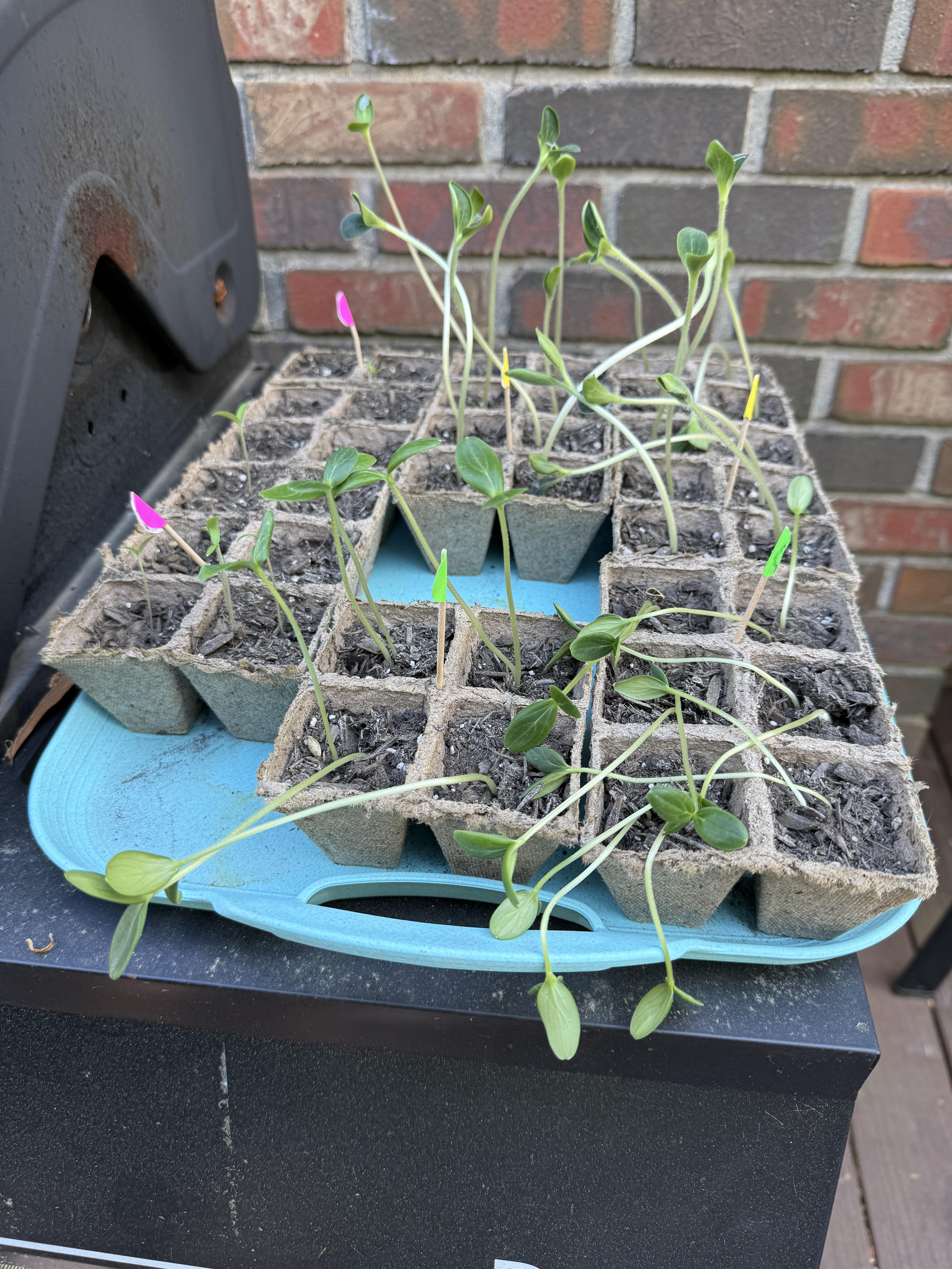 Zum allerersten Mal habe ich versucht, essbare Pflanzen aus einem Samen zu züchten. Oder wirklich jede Pflanze. Es schien ihnen gut zu gehen, und dann brachen alle zusammen. Vielleicht mochte ich sie mit Wasser zu sehr? Sie standen unter einem sanften weißen Wachstumslicht, aber ich nahm sie mit nach draußen, damit sie für morgen etwas natürliche Sonne haben.
