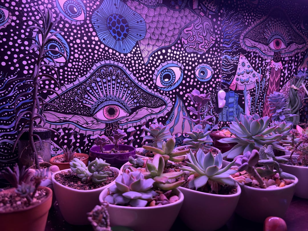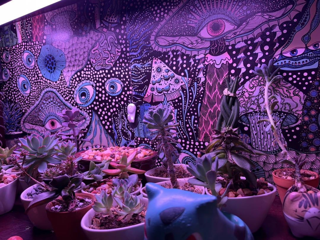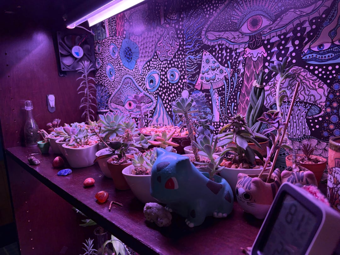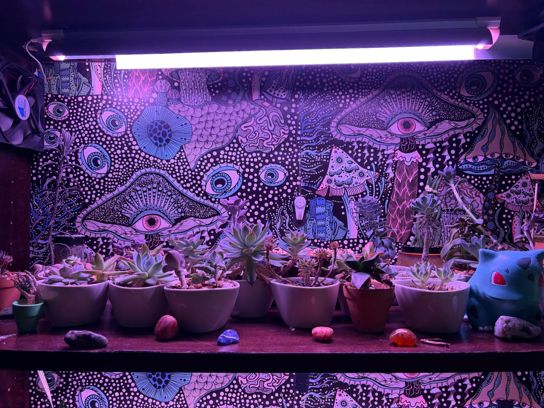 Choose leafier low light plants for an indoor setup like this. Succulents need FULL SUN to thrive and if you got lights bright enough you would need sunglasses in the room. Cool back drop though 👍
