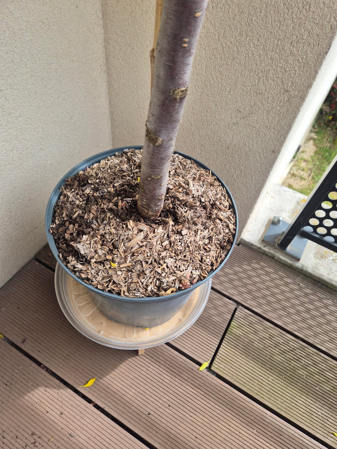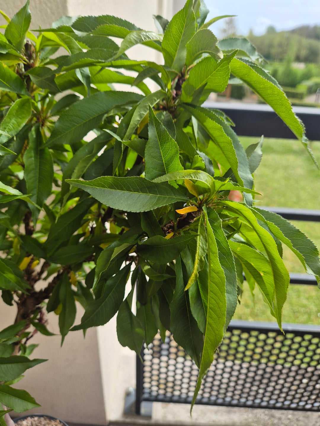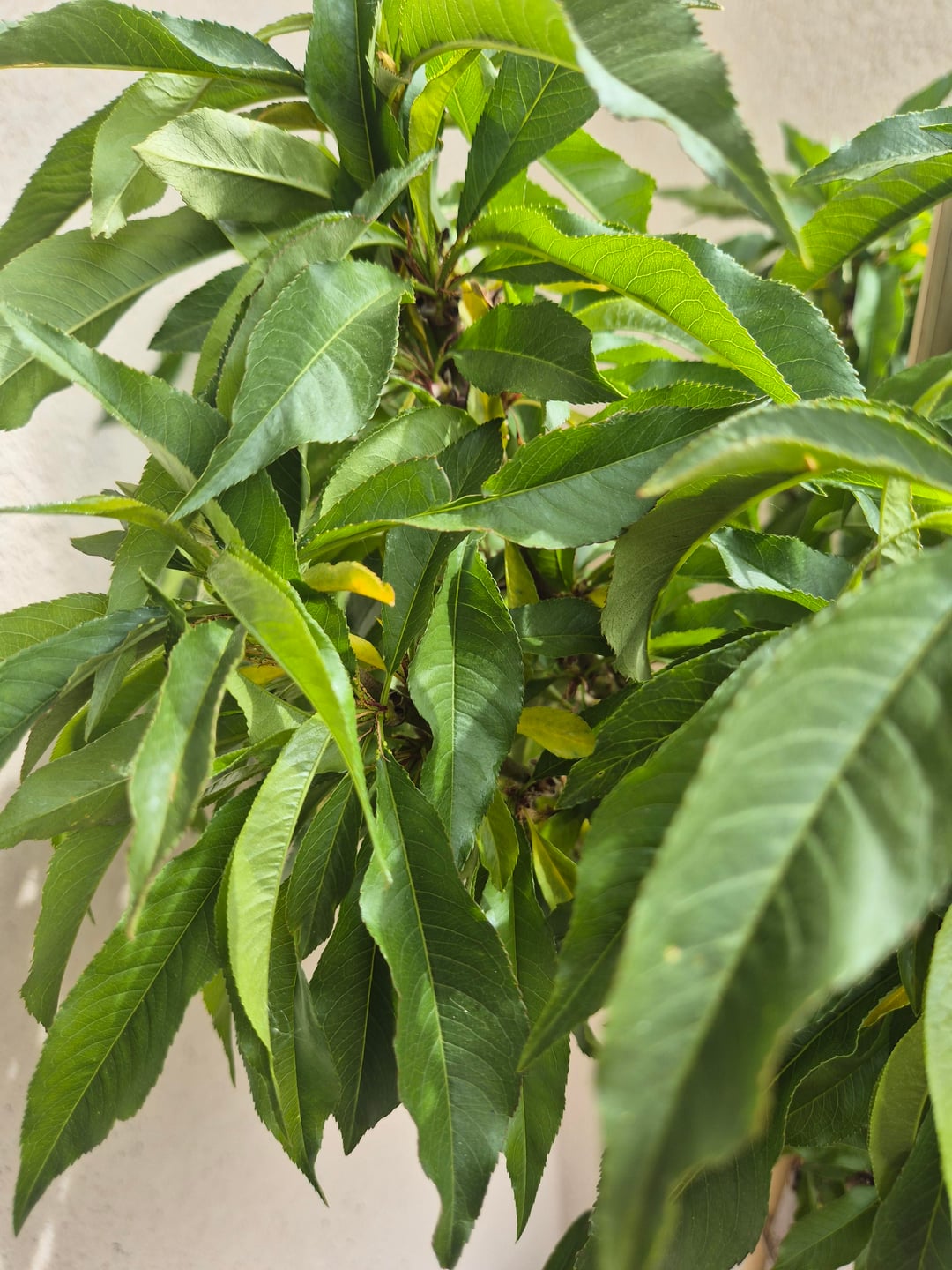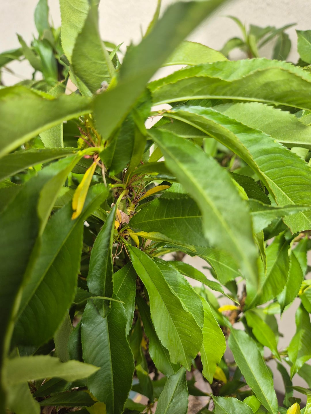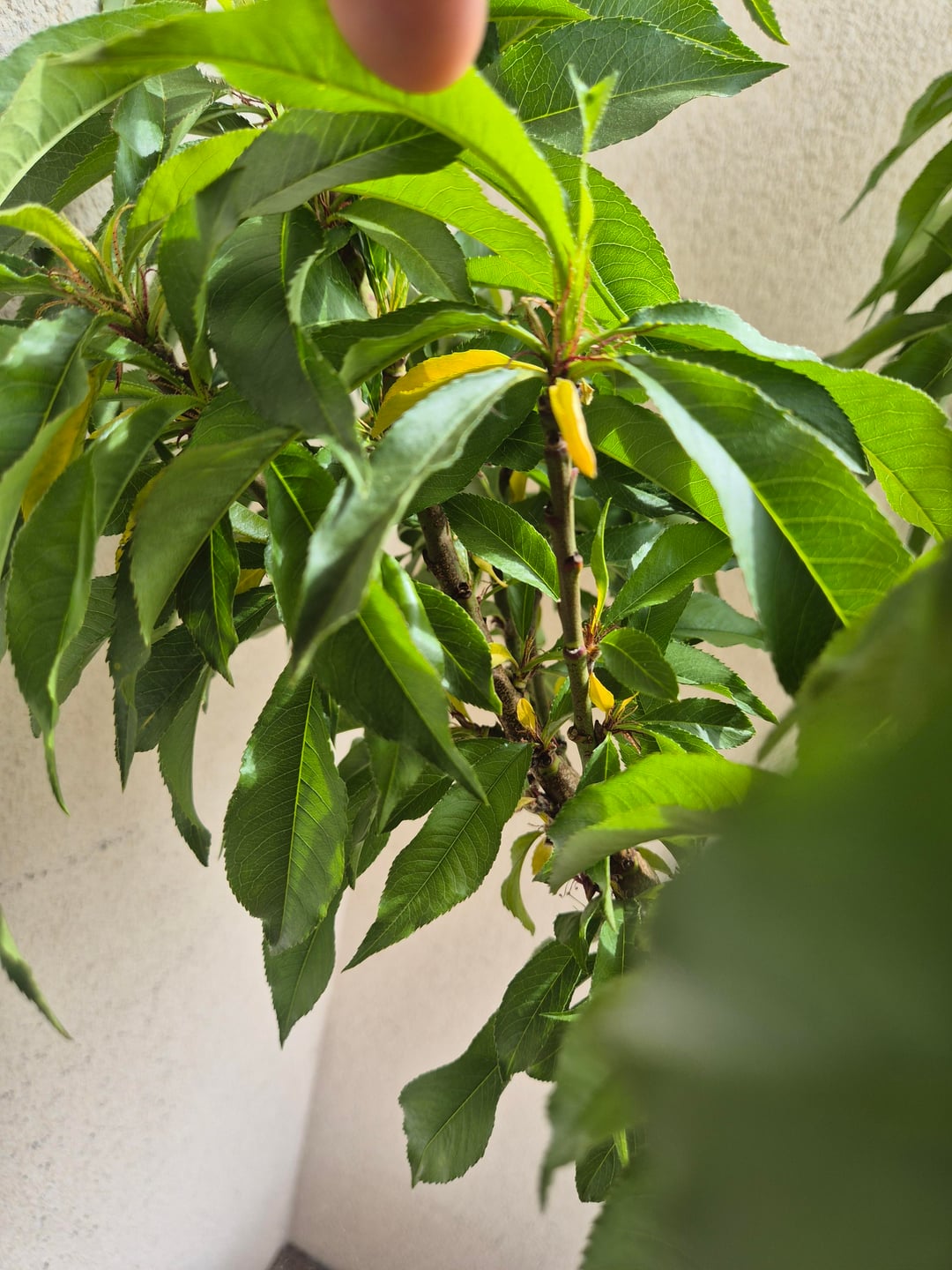 Ich habe diesen jungen Zwergpfirsichbaum seit ein paar Monaten und bemerke, dass alle neuen Blätter gelb werden oder gelb werden. Wie kann ich das beheben?