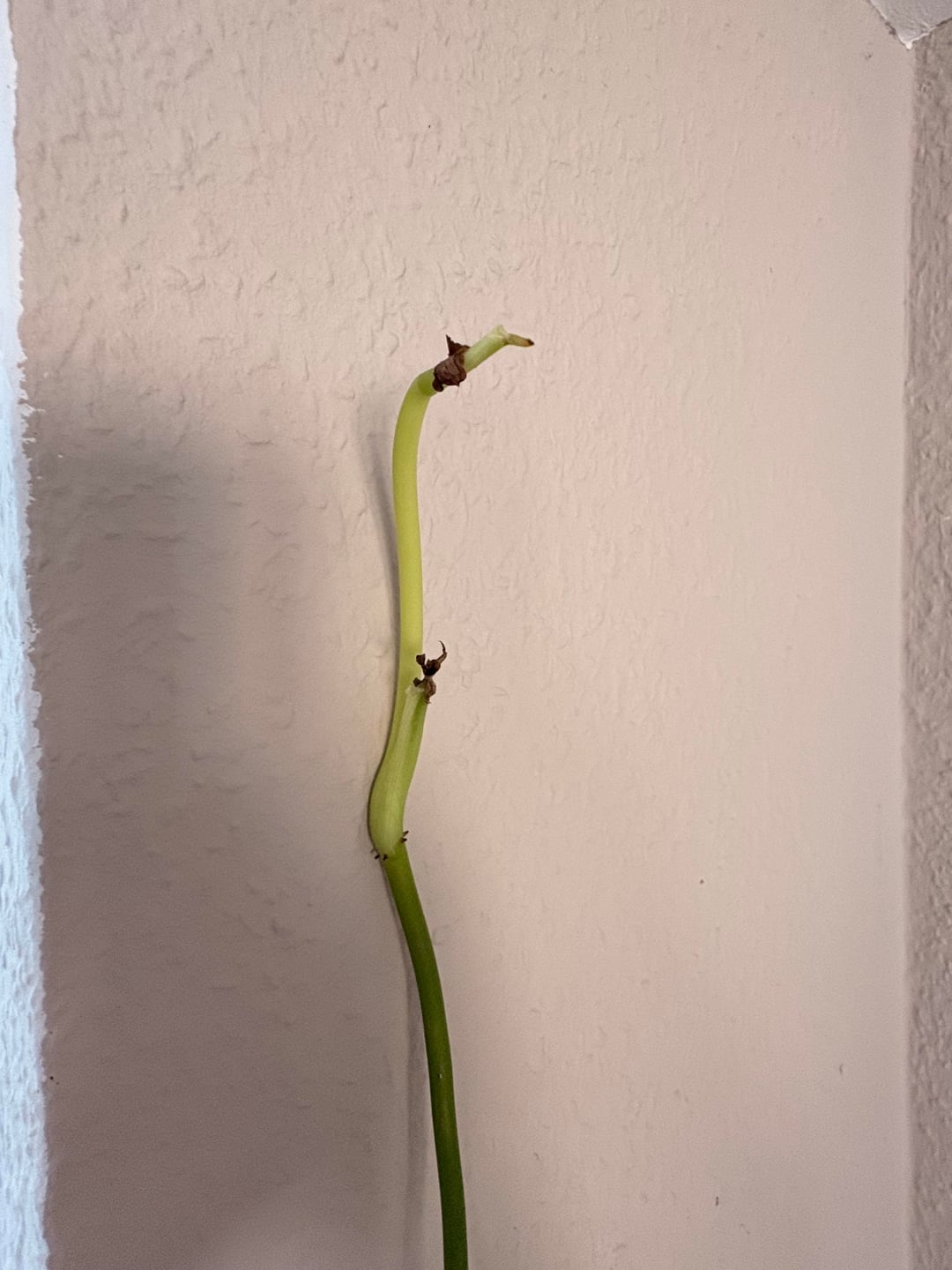 Seitdem entwickelt die Pflanze keine richtigen Blätter mehr. Erst sieht alles normal aus und dann geht das Blatt ein und der Stamm wächst weiter..