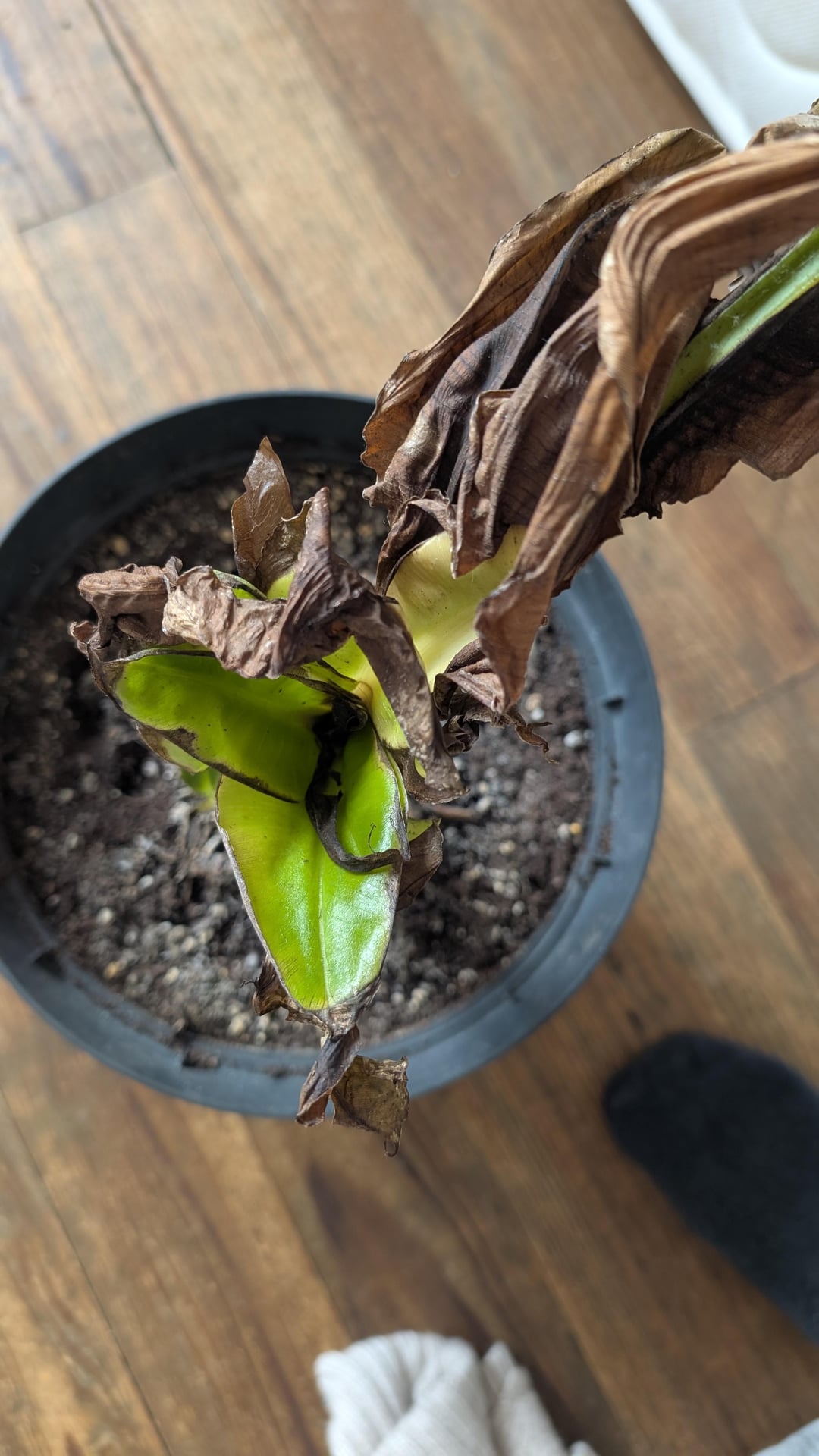 Ich habe eine Musa-Bananenstaude in einem Topf im Haus. Seit einiger Zeit werden die äußeren Blätter schwarz, auch das Herz fängt an, schwarz zu werden.