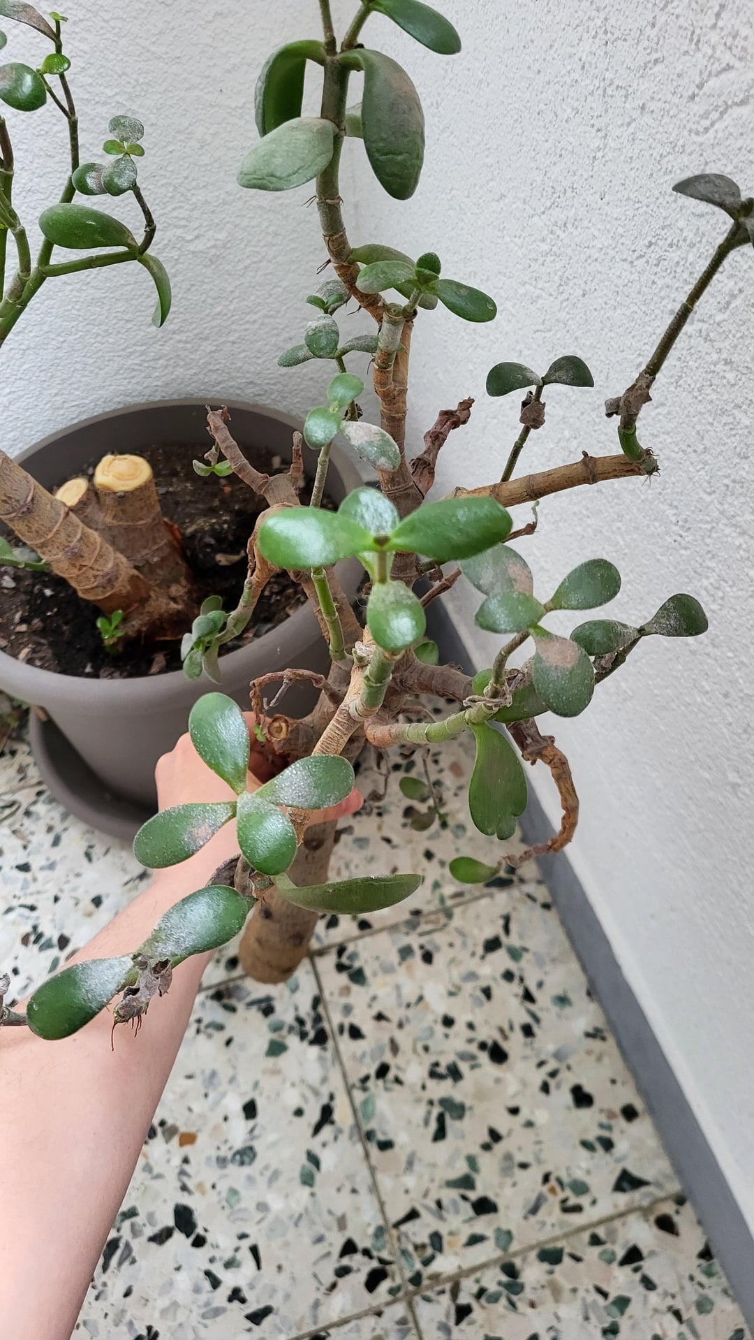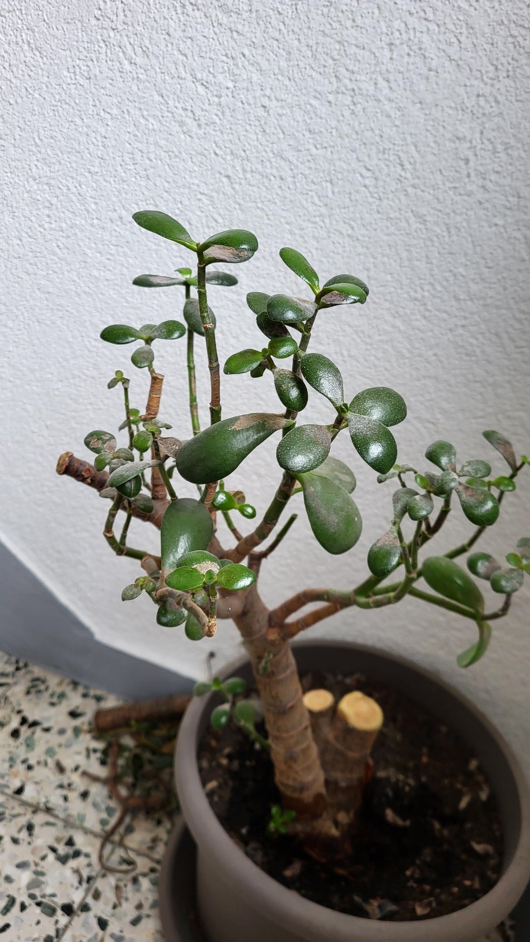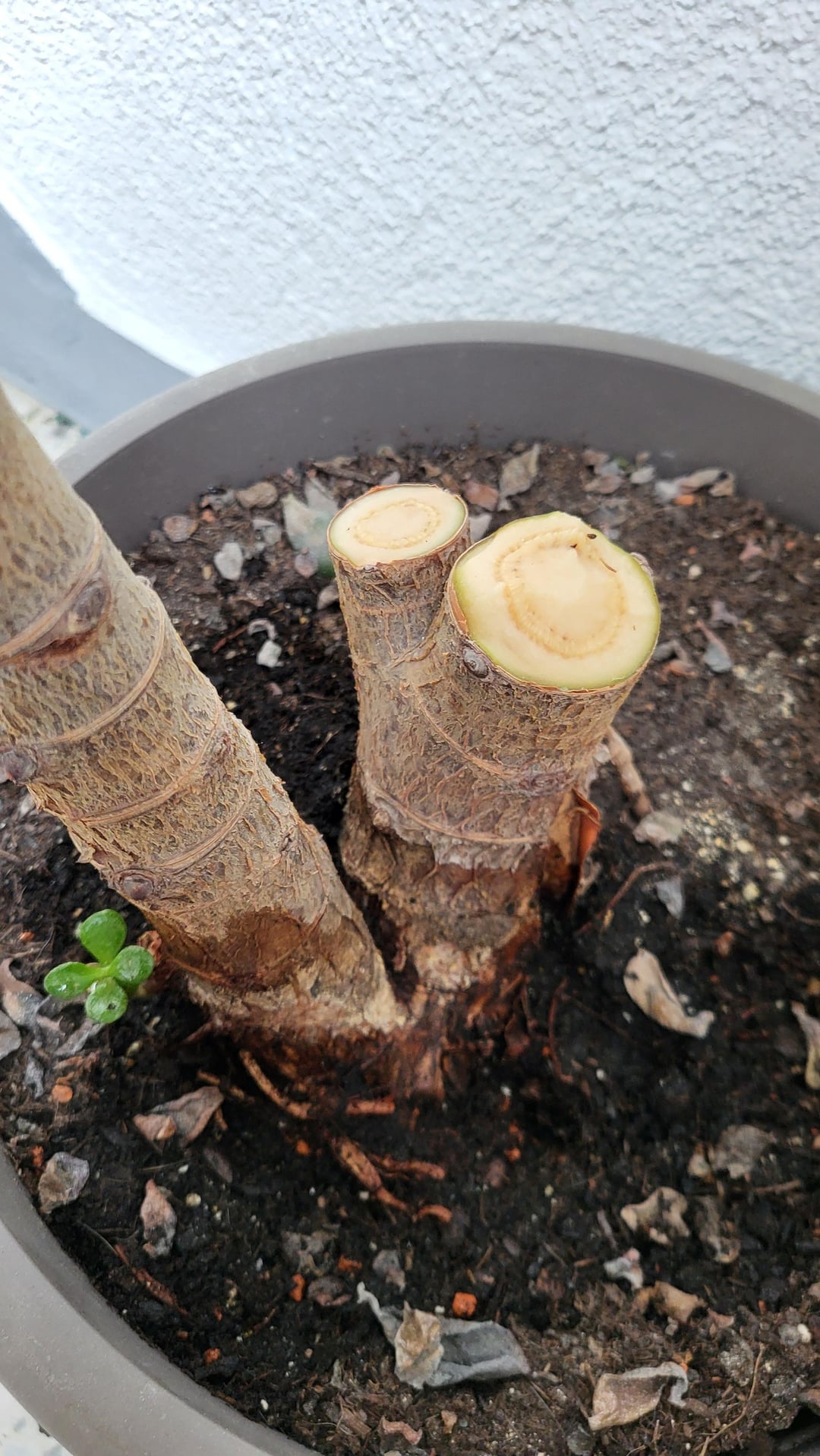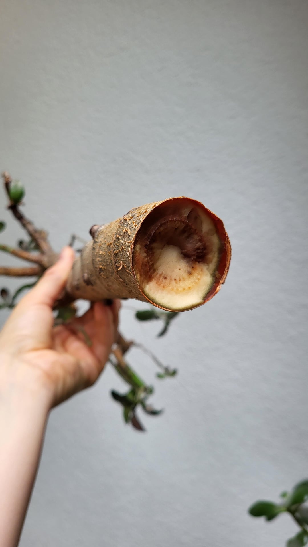 Jedenfalls sieht die Pflanze schon ne Weile seltsam aus und ich hab mir schon lange vorgenommen, sie zurückzuschneiden. Grade wollte ich sie genauer untersuchen und dabei sind zwei der Hauptarme einfach abgefallen, ohne Krafteinwirkung. Der letzte wirkt relativ stabil, aber wirklich dran rütteln wollte ich jetzt auch nicht. Was ist hier passiert? Wenn die Fäule aus der Erde käme, würde der Stamm doch von unten nach oben verrotten, oder? Der Stamm sieht ja aber noch gut aus?? Kann ich jetzt irgendwie noch was retten, umtopfen? Den einen Ast noch weiter abschneiden und in Wasser stellen? Der dritte ist übrigens komplett verschrumpelt, da brauch ich nicht zu fragen, ob man da noch was machen kann. Die Pflanze war ein selbstgezogenes Geschenk… bin sehr traurig über ihr absterben..