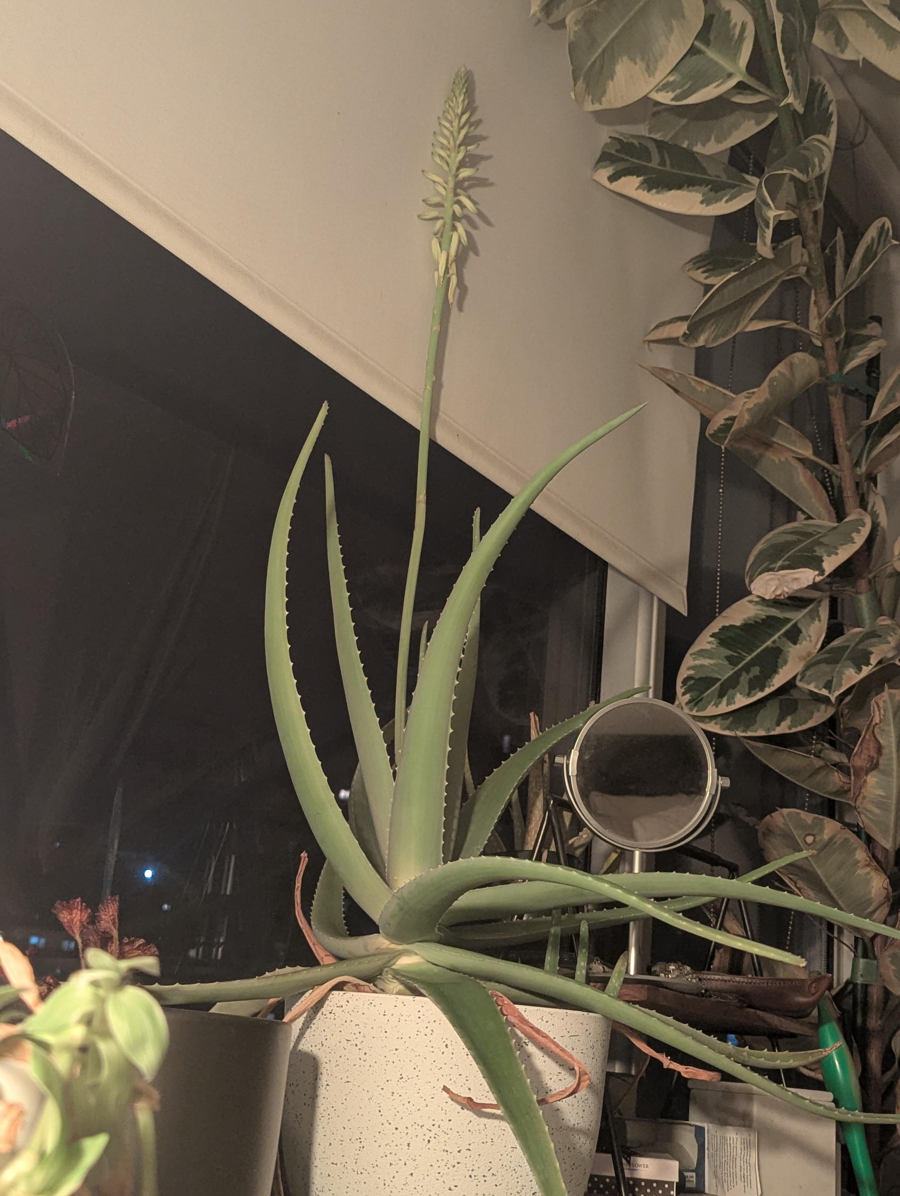 Bei meiner Aloe, die ich seit 8 Jahren habe, ist plötzlich ein Stiel herausgesprungen?! Ist es das? Ich hatte wirklich gehofft, dass die Blume ihre Farbe ändern würde, in ein leuchtendes Rot oder Orange, aber es fängt an, so auszusehen, als ob sie welken würde 😞