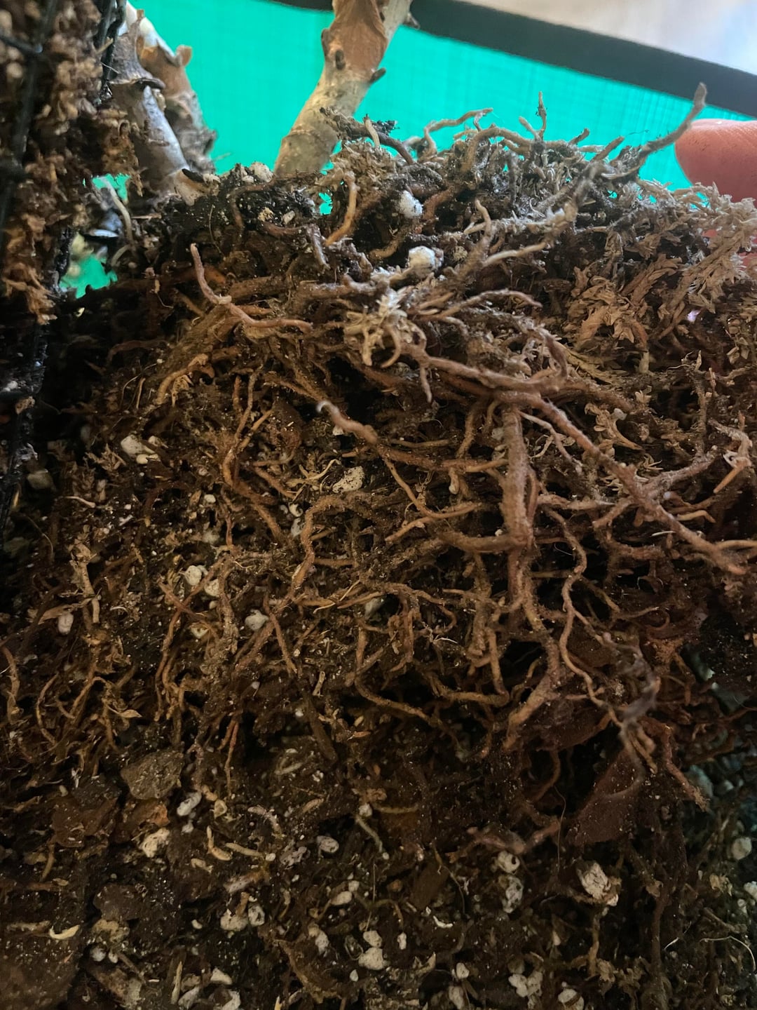 Habe Wurzelfäule vermutet und sie deshalb ausgetopft, konnte aber nichts Fauliges erkennen. Auf Tripse o.ä. habe ich kontrolliert, aber habe nichts gefunden.