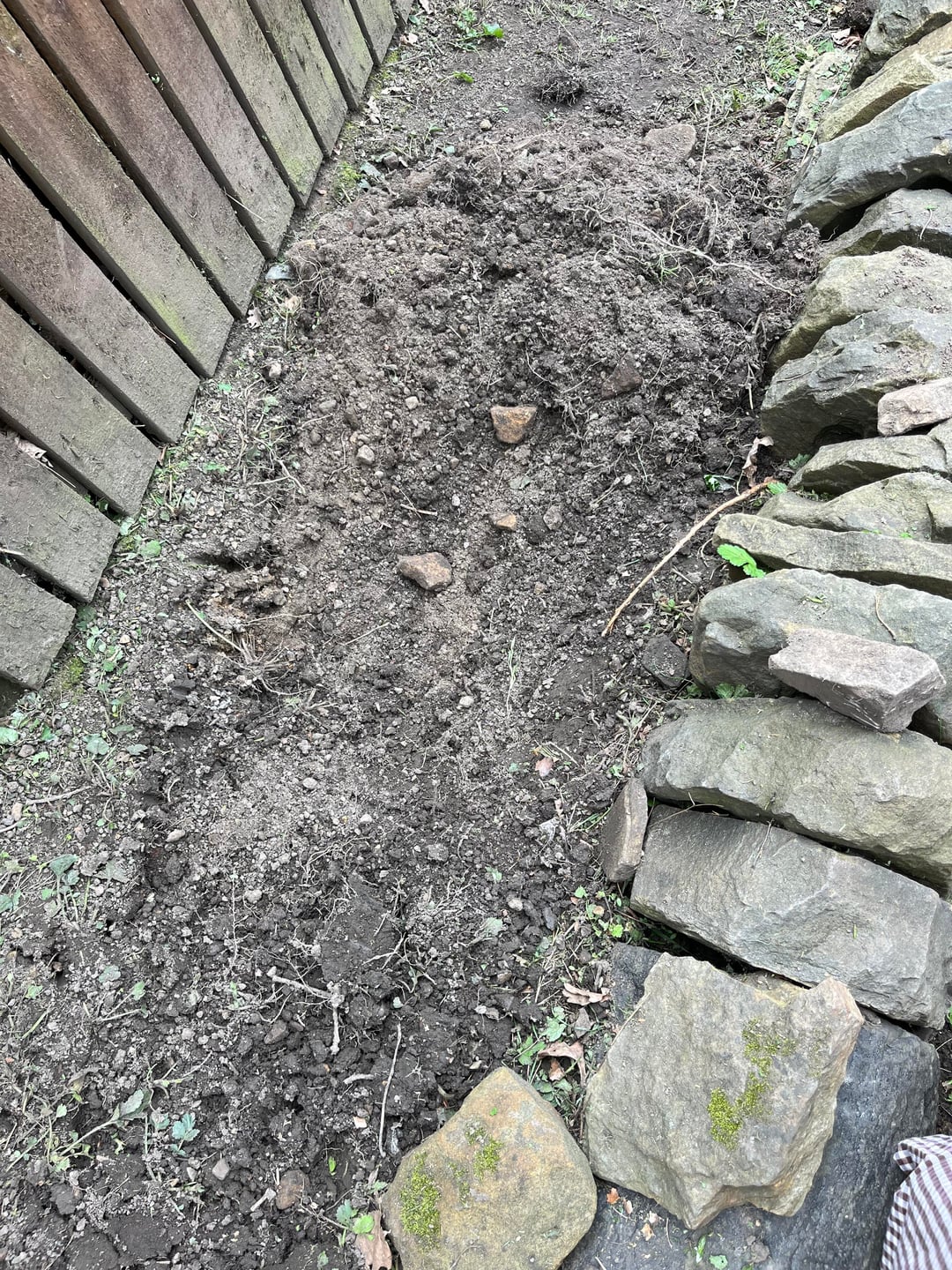 Ich habe diesen schattigen Bereich, für den ich Funkien, Farne und kriechende Glockenblumen gekauft habe. Ich hoffe, in diesem Bereich ein paar Yorkshire-Steine zu verteilen und einen grünen Steingartenbereich zu schaffen. Meine Frage ist, dass sich beim Graben alte Betonstufen unter der Erde befinden (das zweite Bild zeigt, dass wir nicht so tief graben können). Können wir also stattdessen die Erde anbringen und das wird für das Wachstum der Pflanzen ausreichen, oder müssten wir den Beton darunter aufbrechen, damit die Pflanzenwurzeln tiefer eindringen können?