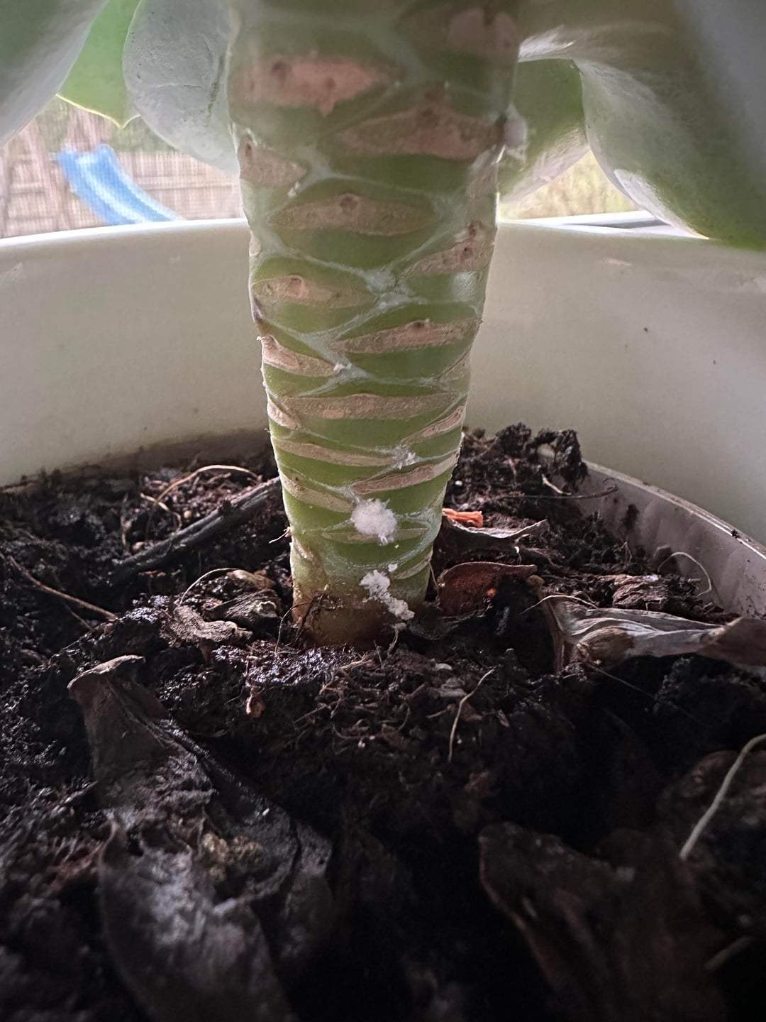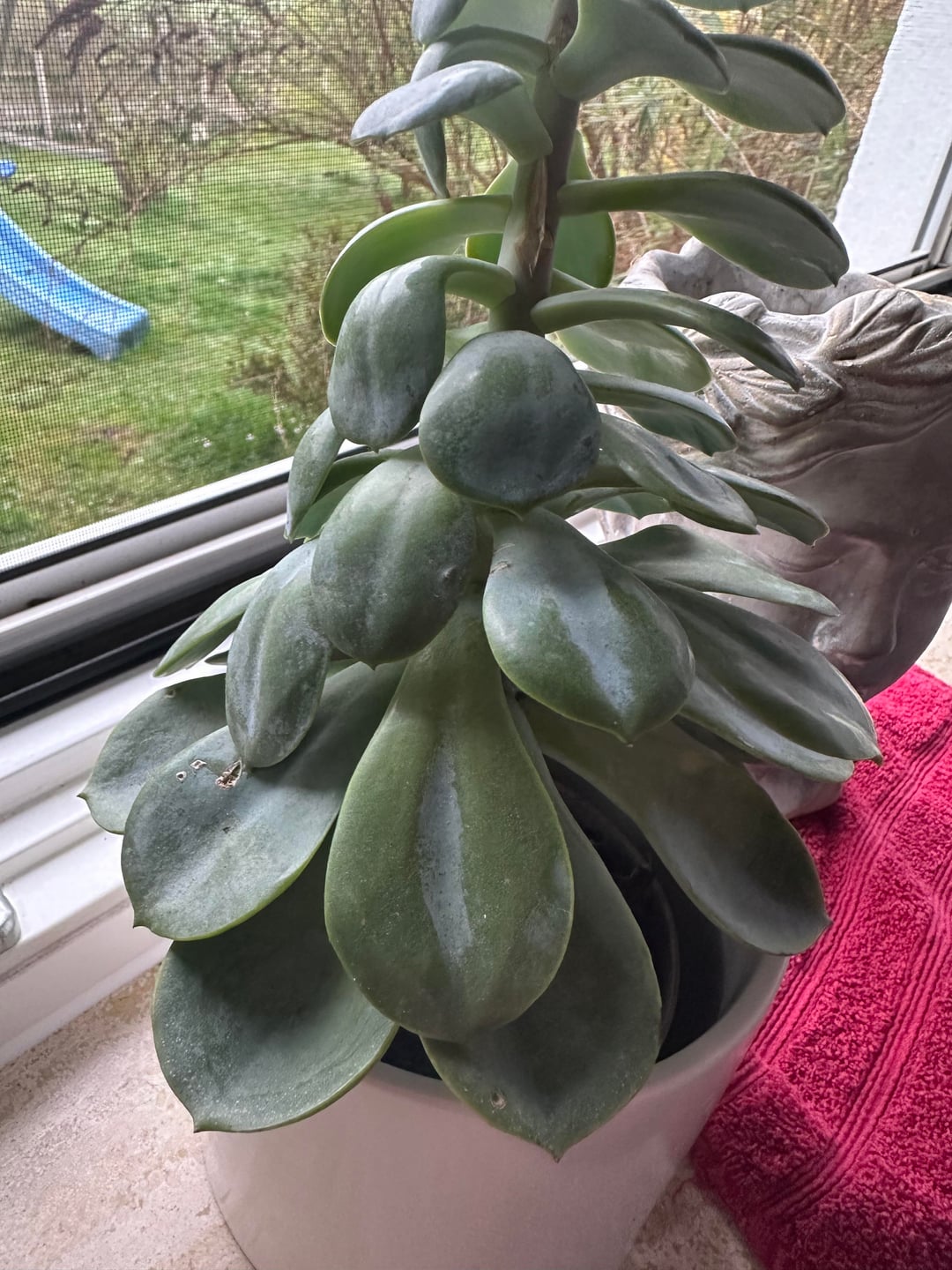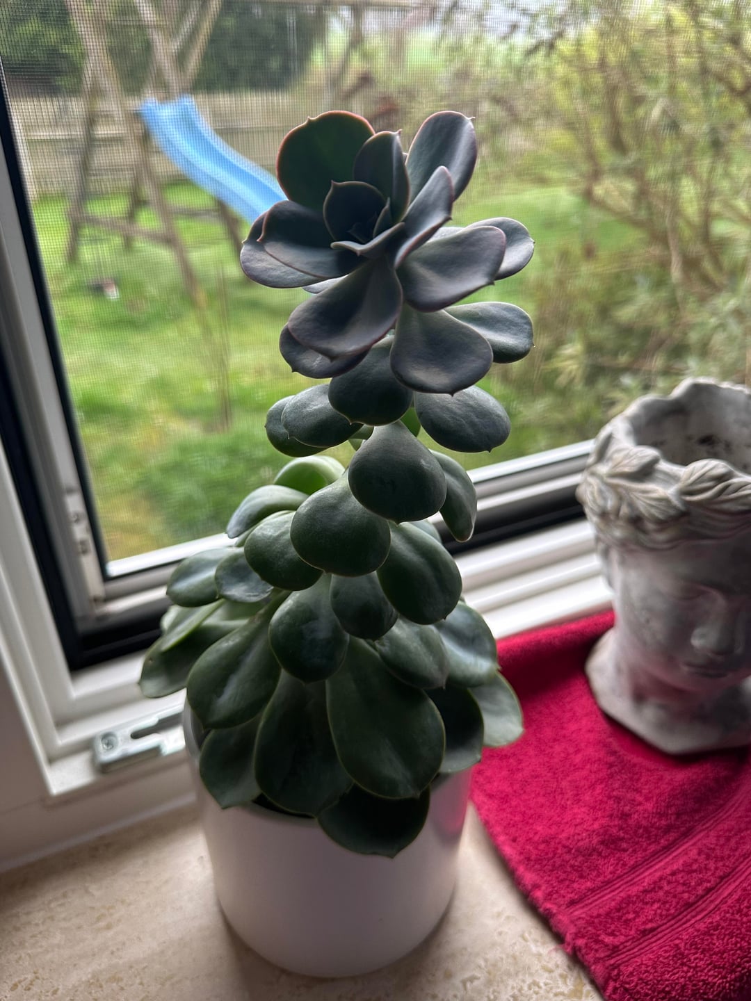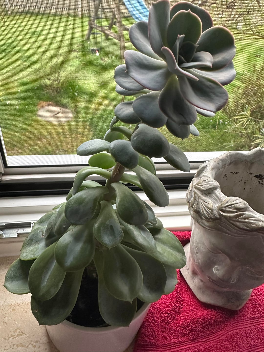 Hallo, ich habe diese Pflanze von meiner Mama bekommen aber keiner wusste wie sie heißt. Ich habe nun herausgefunden das sie höchstwahrscheinlich eine Echeveria ist und ich ihr zu wenig Licht gegeben habe weshalb sie sich streckte. Wie kann ich sie retten und was sind diese weißen Punkte am Stengel?