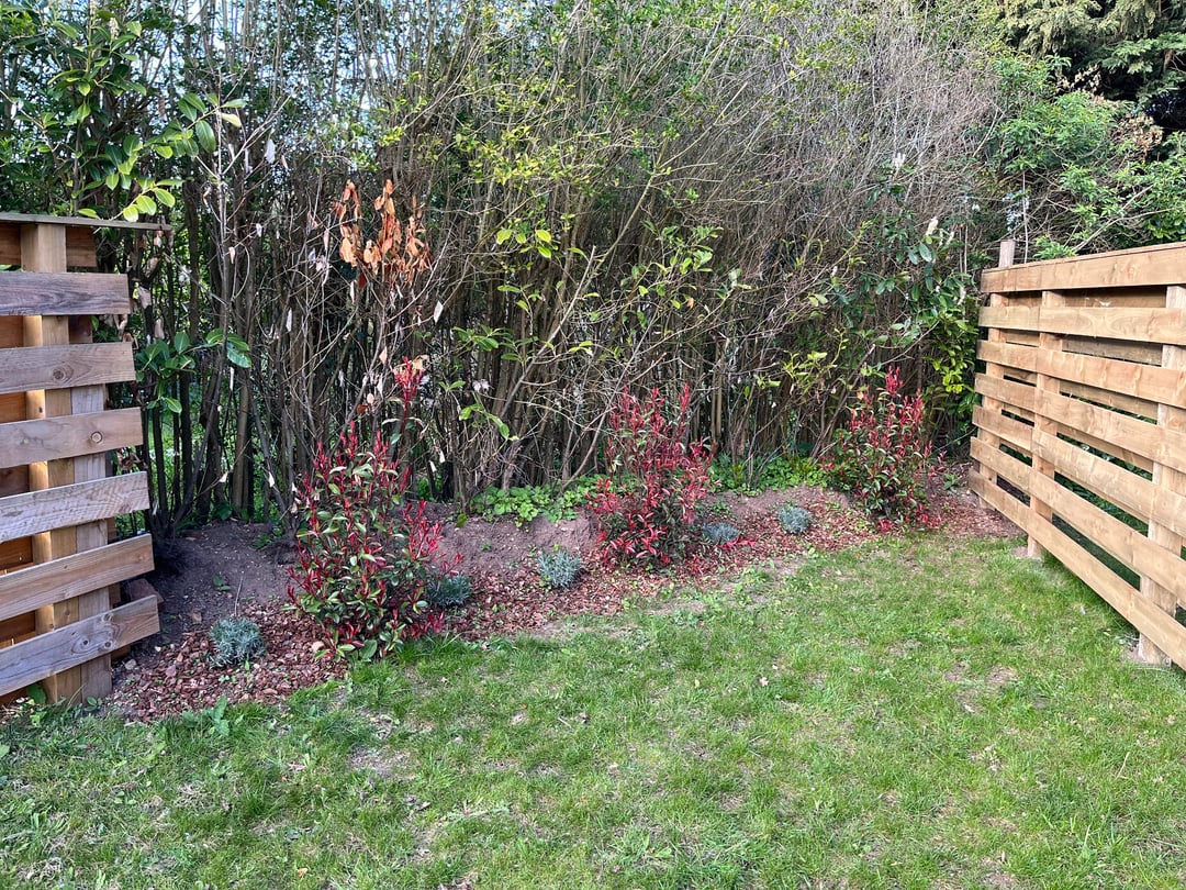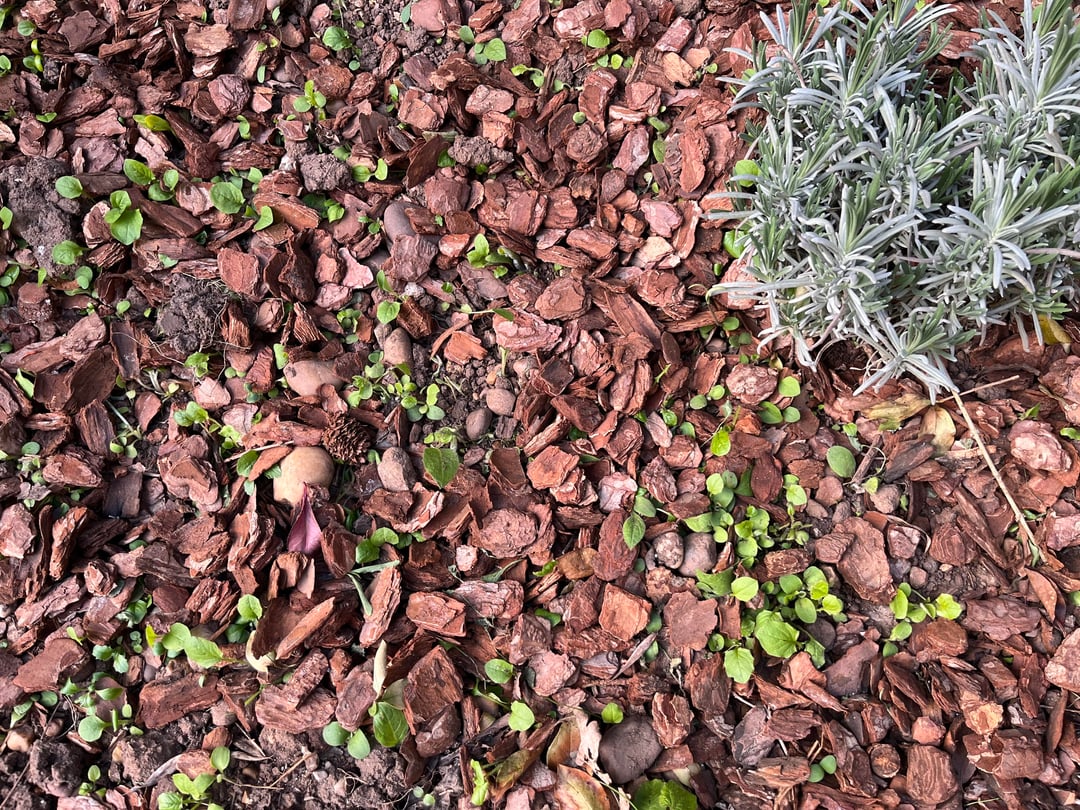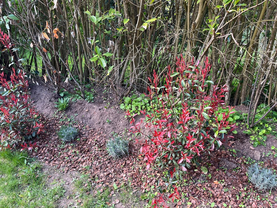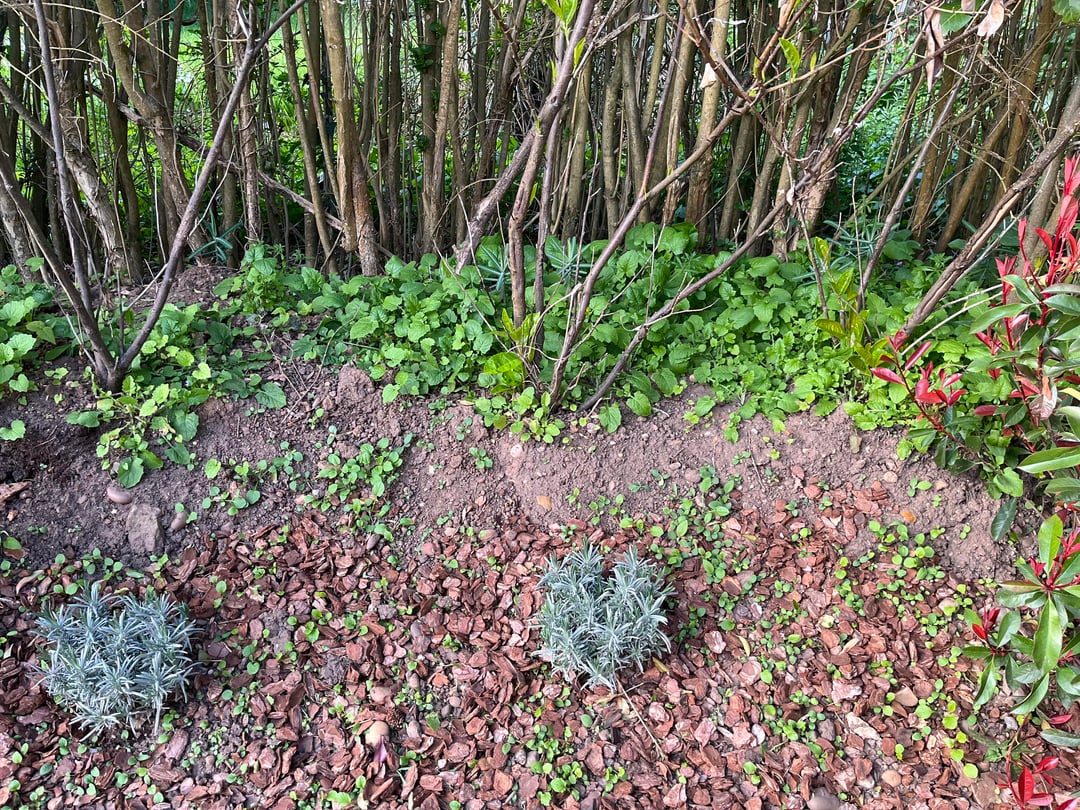 Ich habe versucht, dafür zu sorgen, dass das Ende meines Gartens nicht wie ein verlassenes Durcheinander aussieht. Ich vermute, dass sich unter der Rinde ein ausgedehntes und entwickeltes Unkrautwurzelnetzwerk befindet, da dies vor der Einpflanzung des Rotkehlchens nur ein von Unkraut überwuchertes Ende des Gartenchaos war.