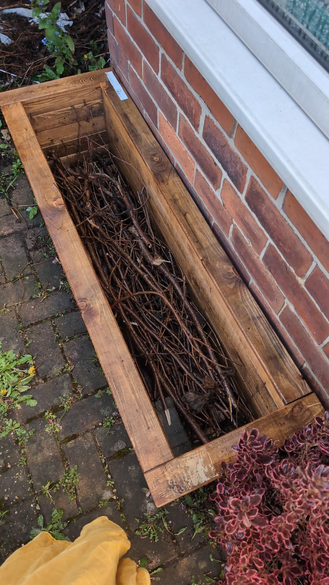 Meine Frage bezieht sich speziell auf den Trog. Was soll ich da hinzufügen, damit die Samen die besten Chancen haben? Ich hatte ursprünglich Mulch, Kompost und Muttererde gekauft und auch ein paar Stöcke und Zweige gesammelt, um sie auf den Boden zu schichten. Reicht das? oder brauche ich auch Sand?