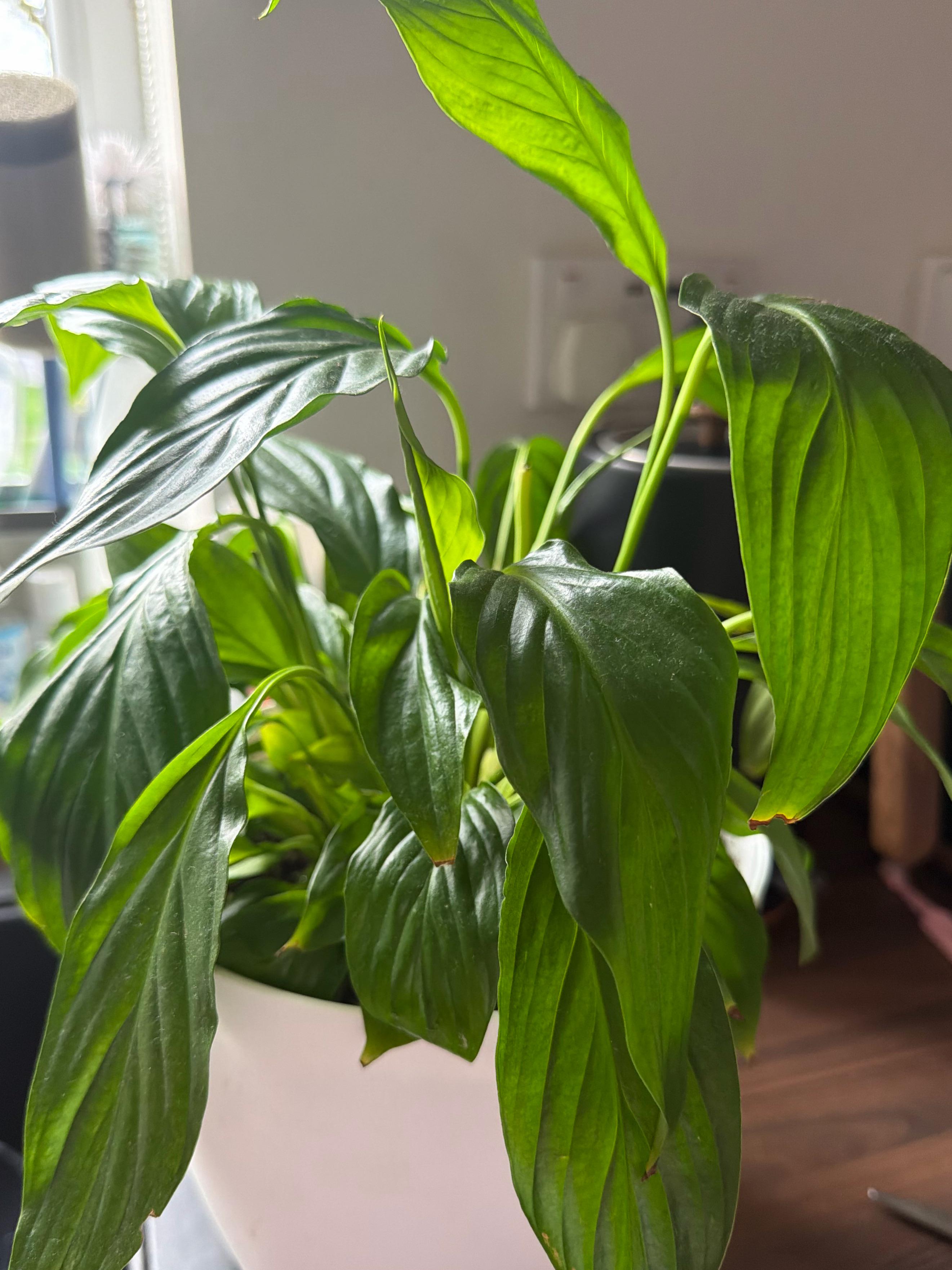 Ich habe diese Friedenslilie seit ungefähr anderthalb Jahren und ihre Blätter wachsen fantastisch! Bis vor etwa 7 Monaten hat sie Blumen geschossen, aber den ganzen Winter/Frühling über hat sie keine einzige hervorgebracht. Ist das normal? Es schießt immer noch Blätter, aber ich fürchte, dass ich hier etwas falsch mache, weil ich dadurch und wegen ein paar brauner Spitzen etwas falsch gemacht habe! (Außerdem weiß ich, dass sie ein wenig schlaff aussieht, ich habe sie nur gegossen, damit sie in der nächsten Stunde sprießen wird.)