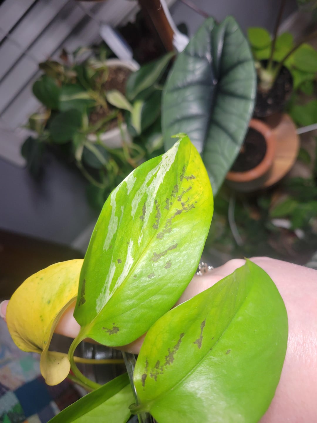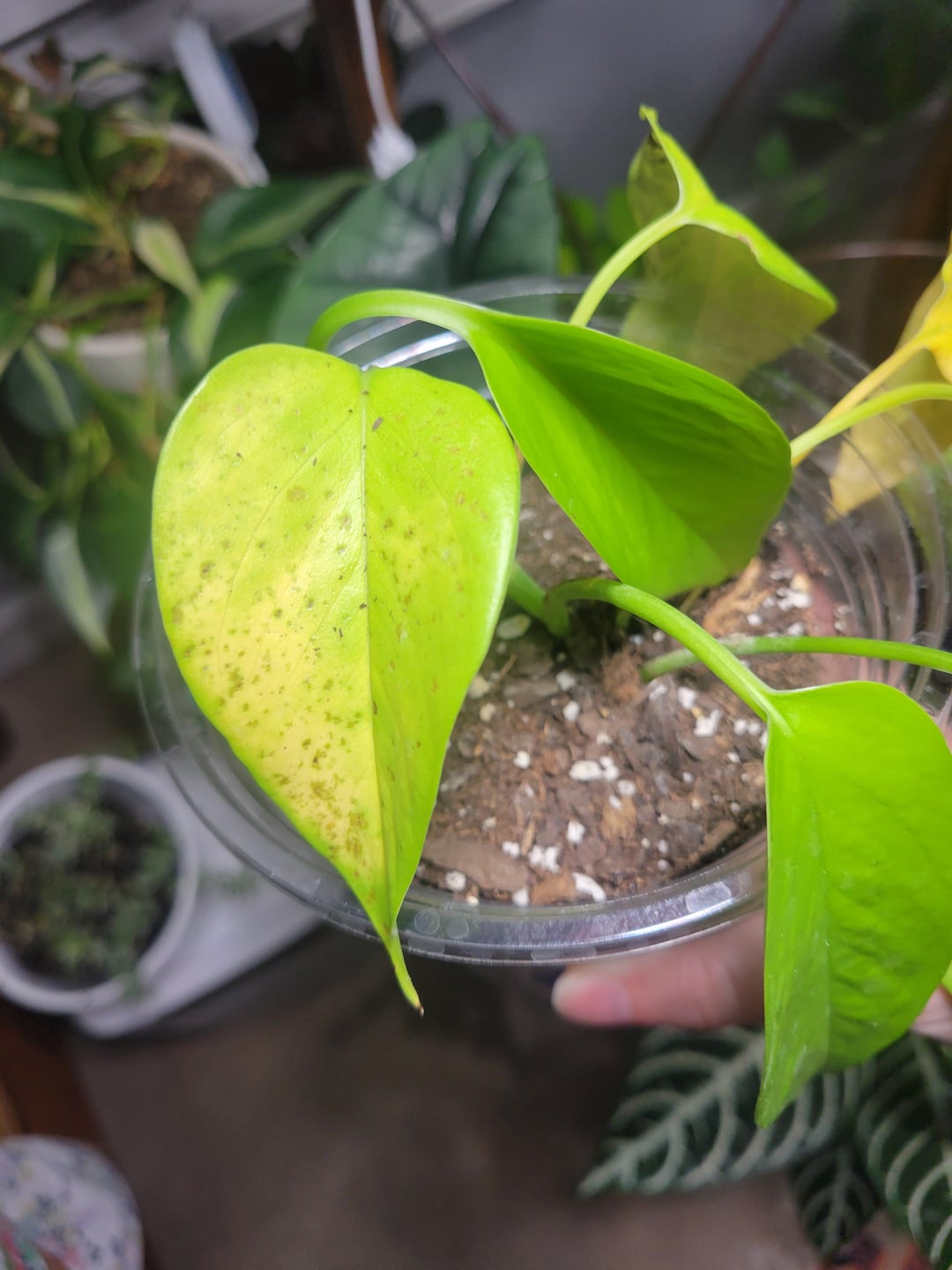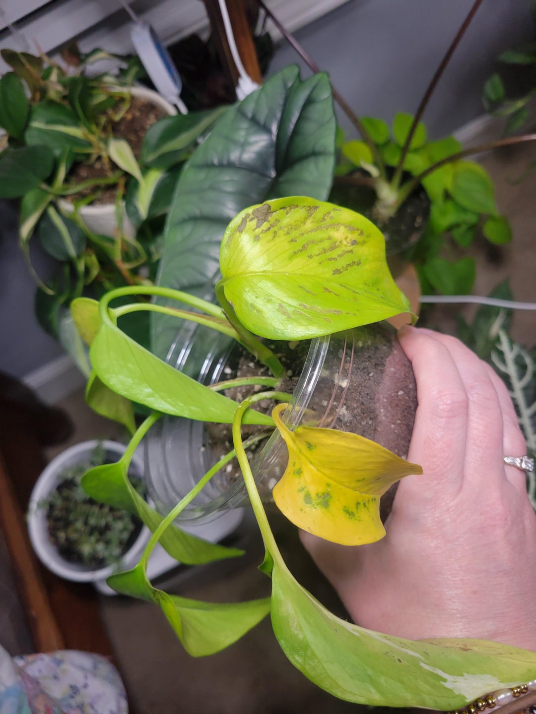 Ich habe es in den letzten Monaten im Wasser mit gesunden Wurzeln stehen lassen, bin in den letzten zwei Monaten auf Erde umgestiegen und habe jede Woche gegossen, und letzte Woche ist das passiert. Meines Wissens hatte es keine direkte Sonneneinstrahlung durch das Fenster, das etwa 60 cm von ihm entfernt stand (ich habe Pflanzenlampen). Irgendwelche Ideen? Das Muster der Verfärbung ist seltsam.