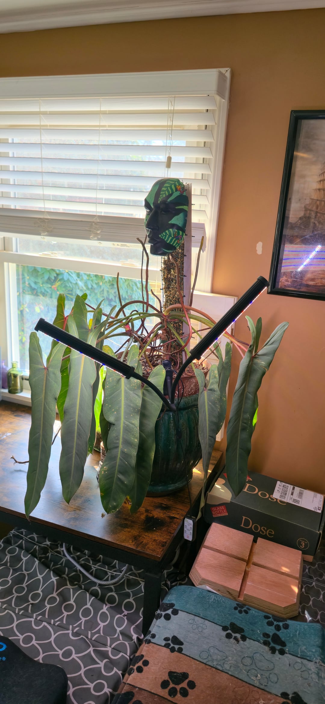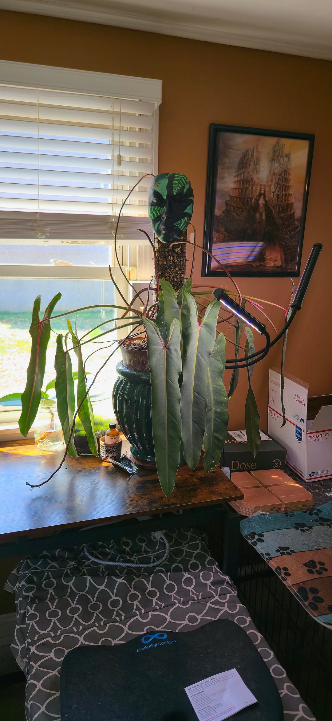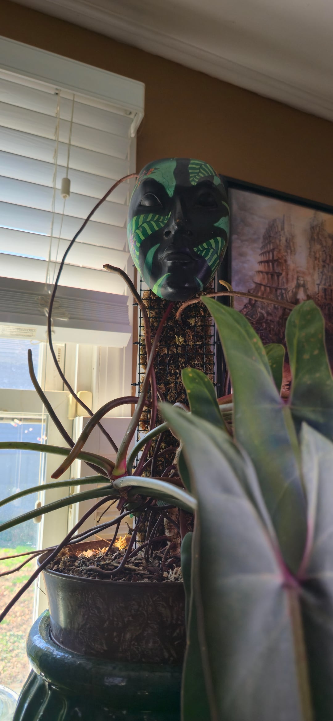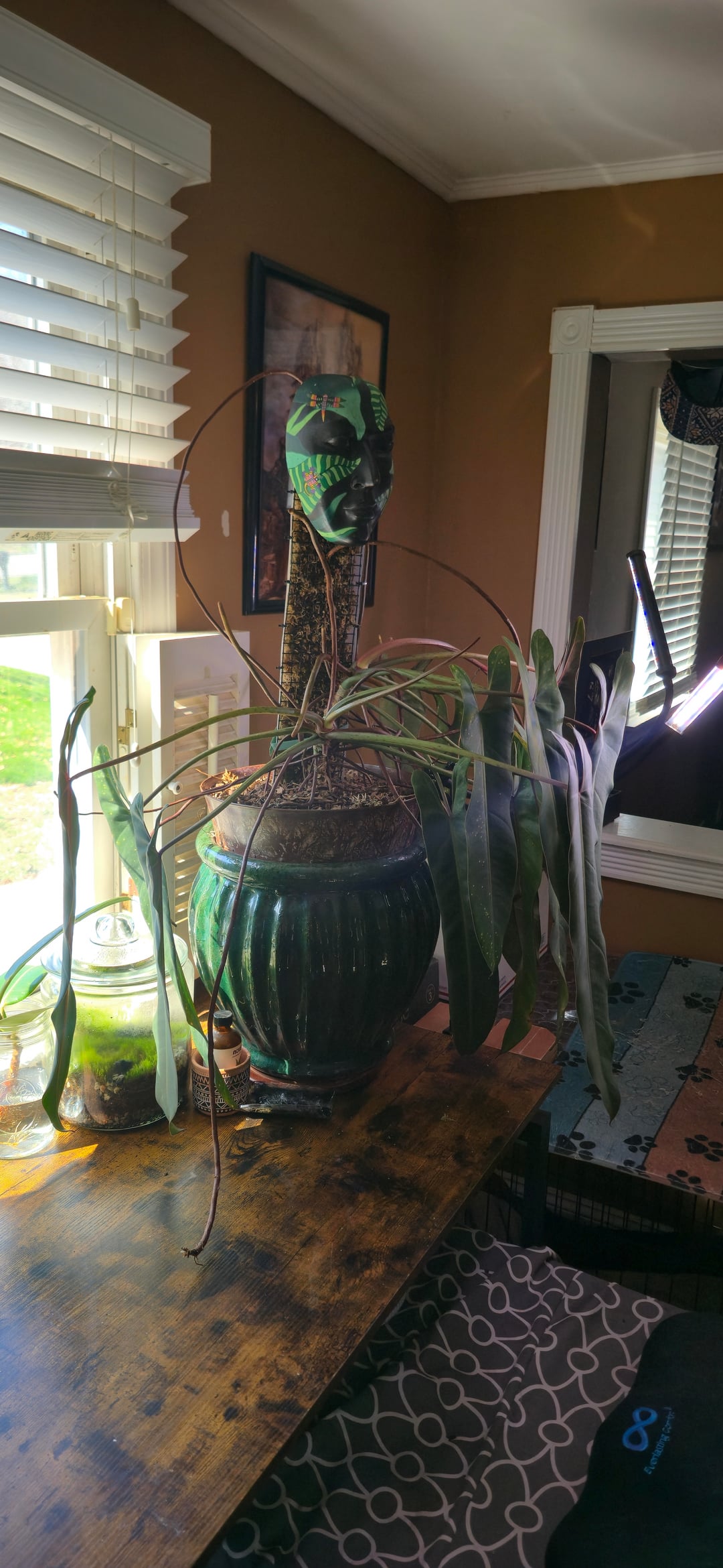 Habe gerade diesen großen Philodendron Spiritus Sancti bei einer Pflanzenauktion für wohltätige Zwecke in einem örtlichen Pflanzenladen (Jordan’s Jungle in Pawtucket, Rhode Island, toller Laden) gewonnen. Es wird an einem großen Seilaufhänger vor diesem etwas schattigen Ostfenster hängen, mit einigen zusätzlichen Klemmlichtern, wie man sieht. Moss hat es gepflückt und diese coole Maske hinzugefügt, die meine Frau seit Jahren im Haus herumträgt. Ich dachte, es wäre cool genug, um es mit der Community zu teilen!