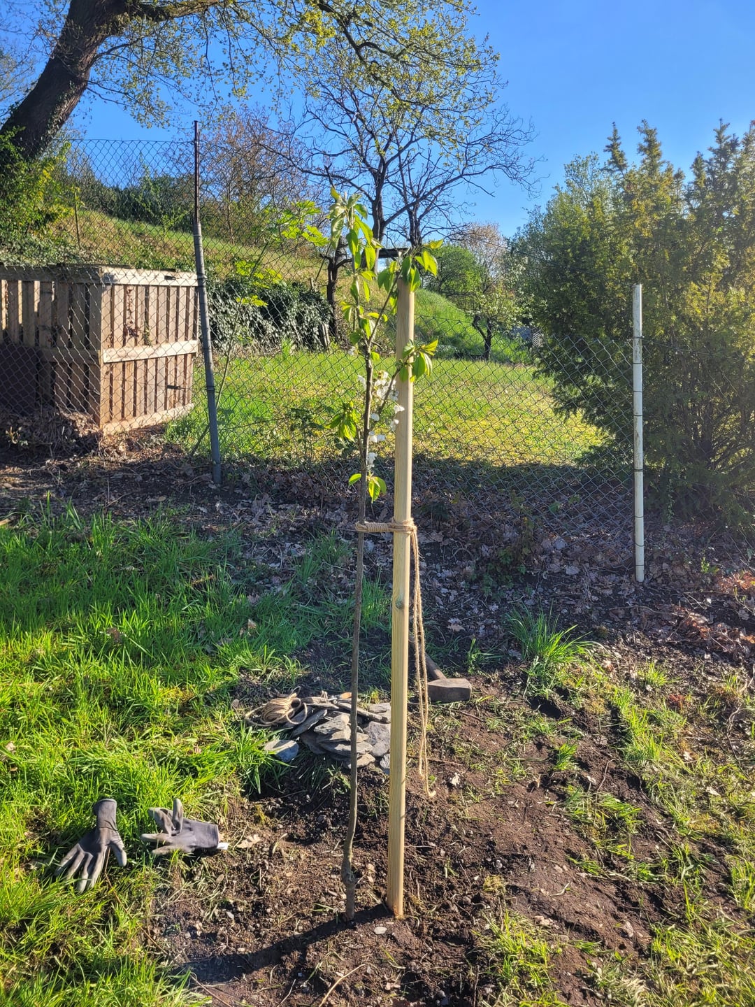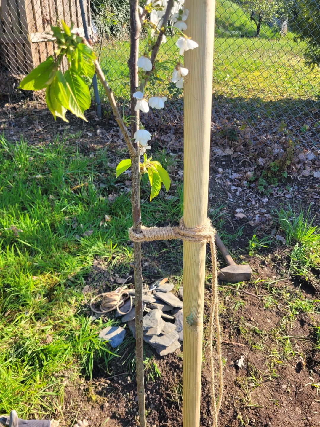 nachdem ich bei einer Verlosung einen einheimischen Süßkirschbaum gewonnen habe, habe ich meinen ersten richtigen Baum gepflanzt. Nach bisschen googeln kam ich auch darauf, dass man ihn in den ersten Jahren anbinden sollte, gerade wenn er nicht unbedingt windgeschützt steht. Gesagt – getan, aber auch richtig?