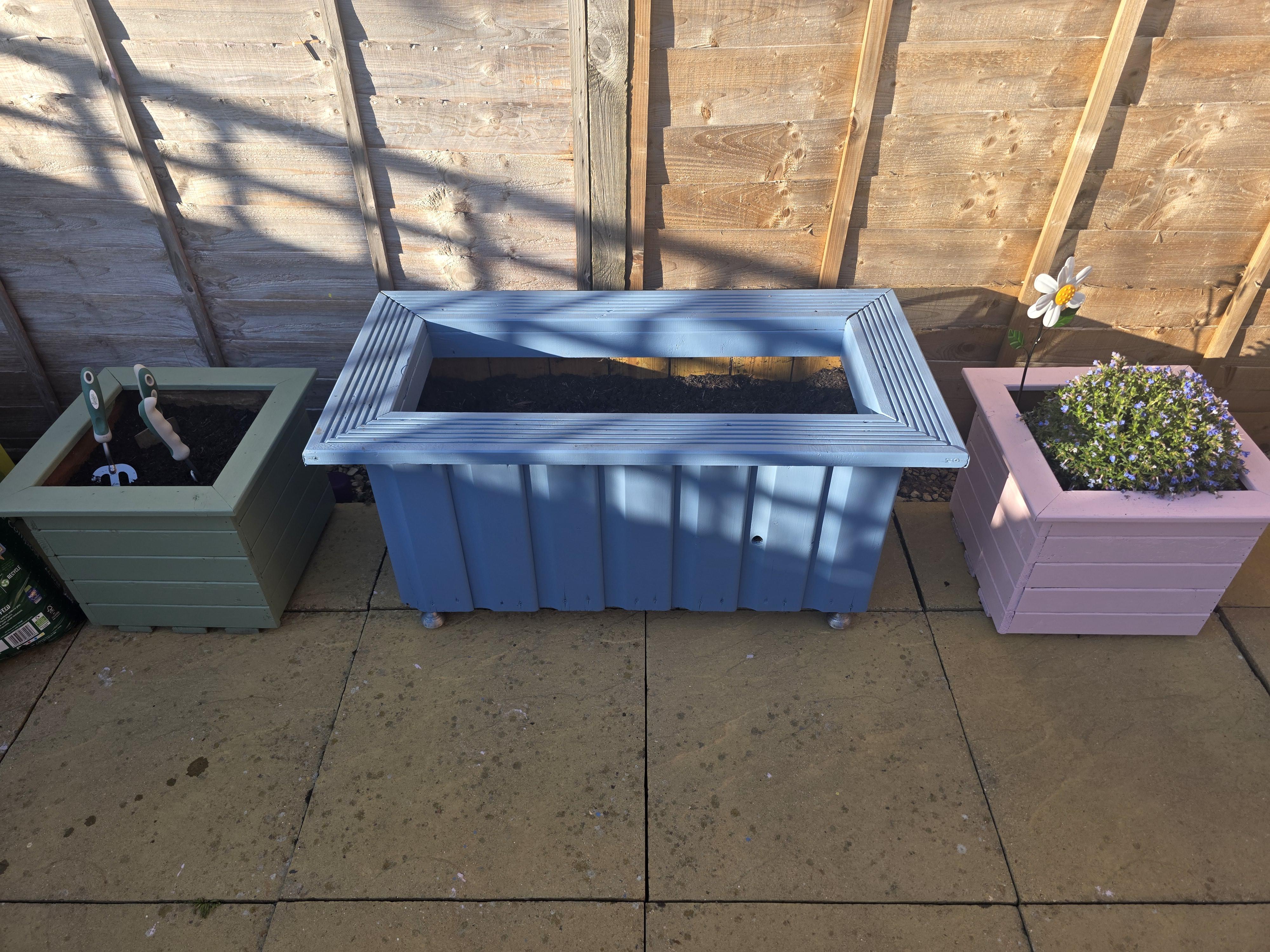Wir haben ein paar Pflanzgefäße, die gefüllt werden müssen. Wir sind neu in der Pflanzen- und Gartenarbeit. Der große blaue Pflanzer ist das, womit wir uns schwer tun, was wir dort hineinpflanzen sollen.