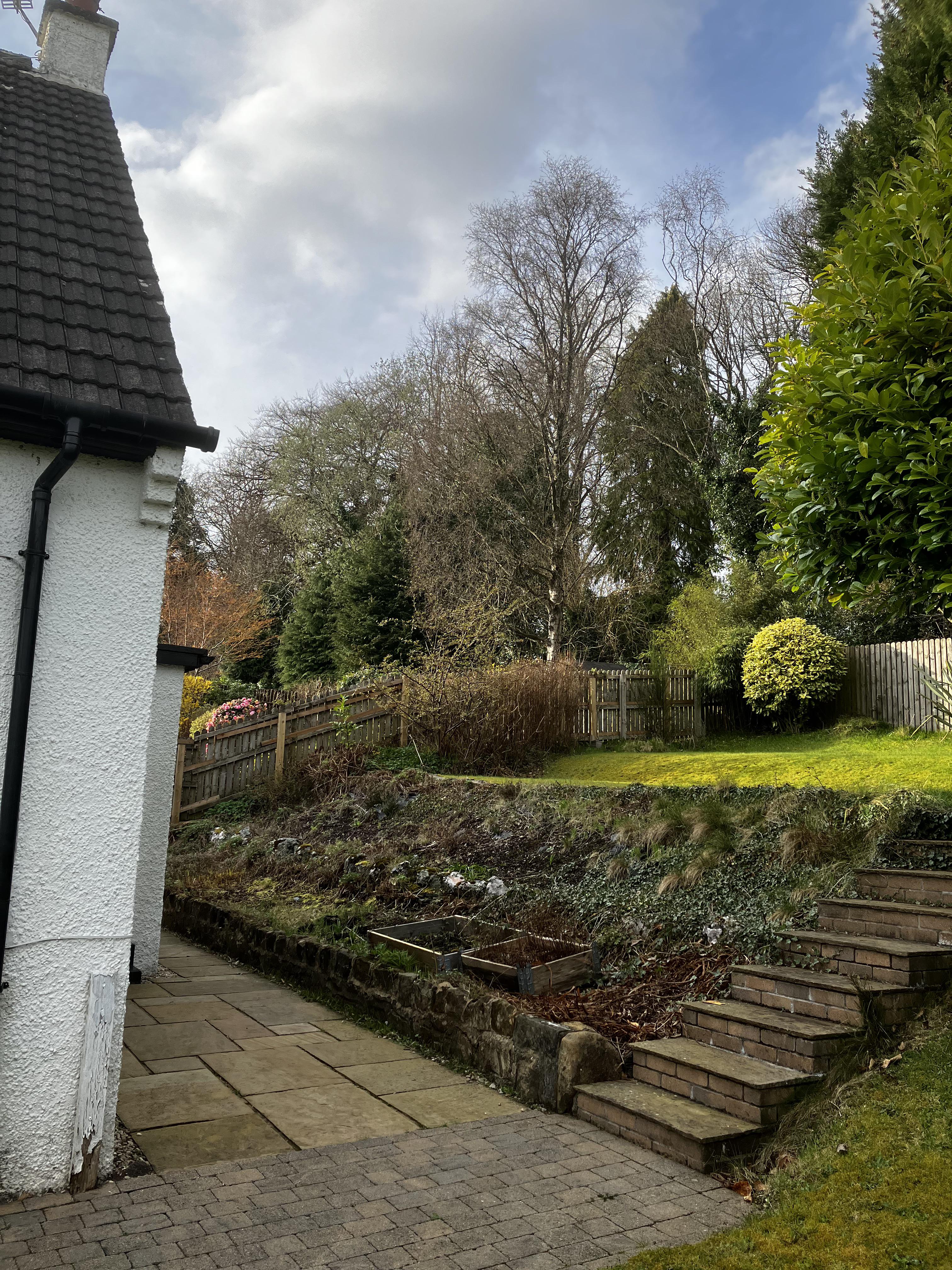 Ehemalige Wohnungsbewohner, die völlig neu in Häusern waren, und zusätzlich zu einer Vielzahl von Schrecken in dem Haus, das wir (bedauerlicherweise) gekauft haben, haben wir etwas, das einmal ein schöner Steingarten war, der über ein paar Schichten hinweg als Stützmauer zu dienen scheint. Hinter gemulchtem Holzspänen oder ähnlichem liegt schwarzes Plastik und eine Handvoll Pflanzen ragen hindurch. Dazu Efeu. Plus Spinnen, da bin ich mir sicher.