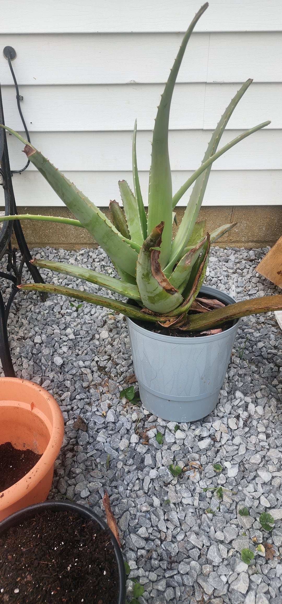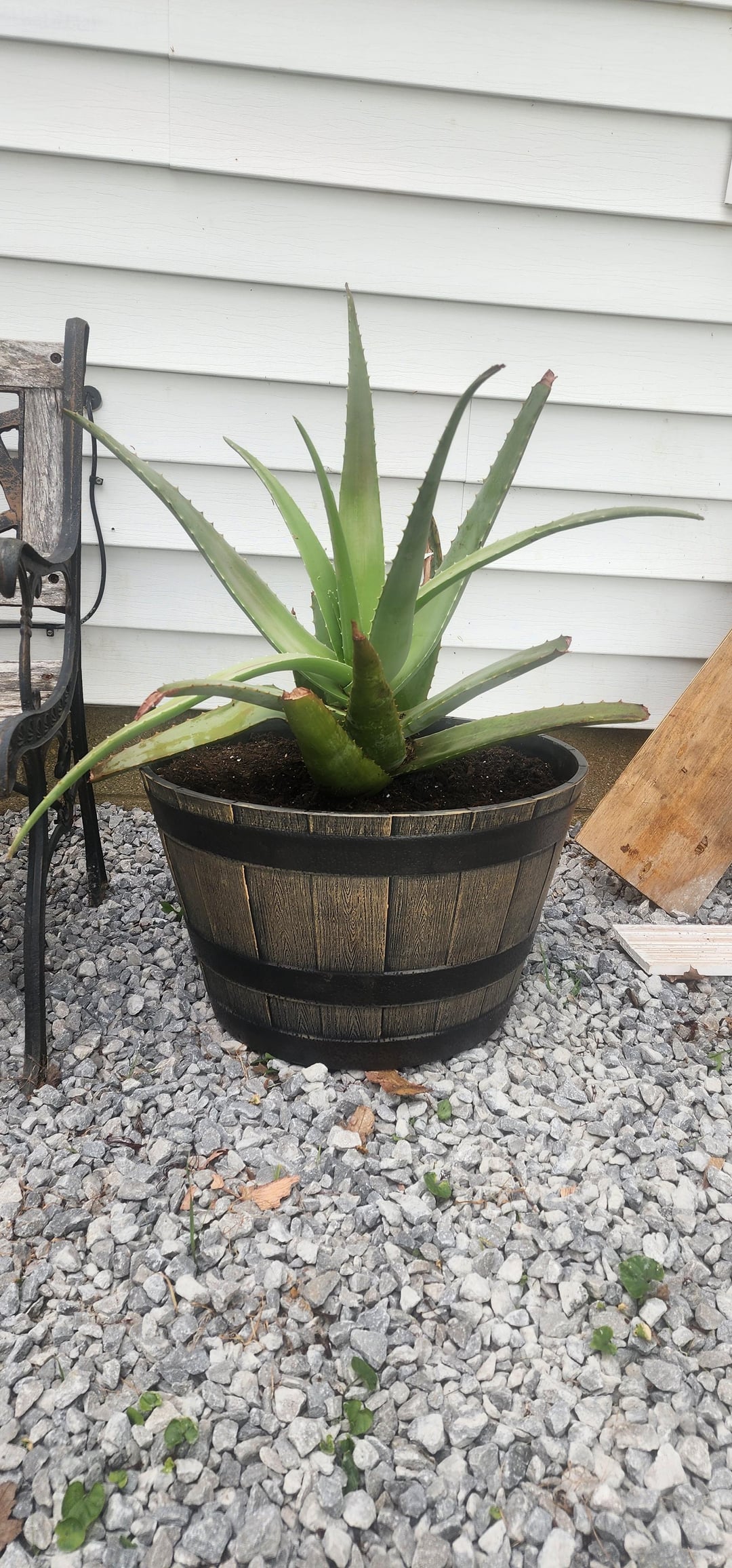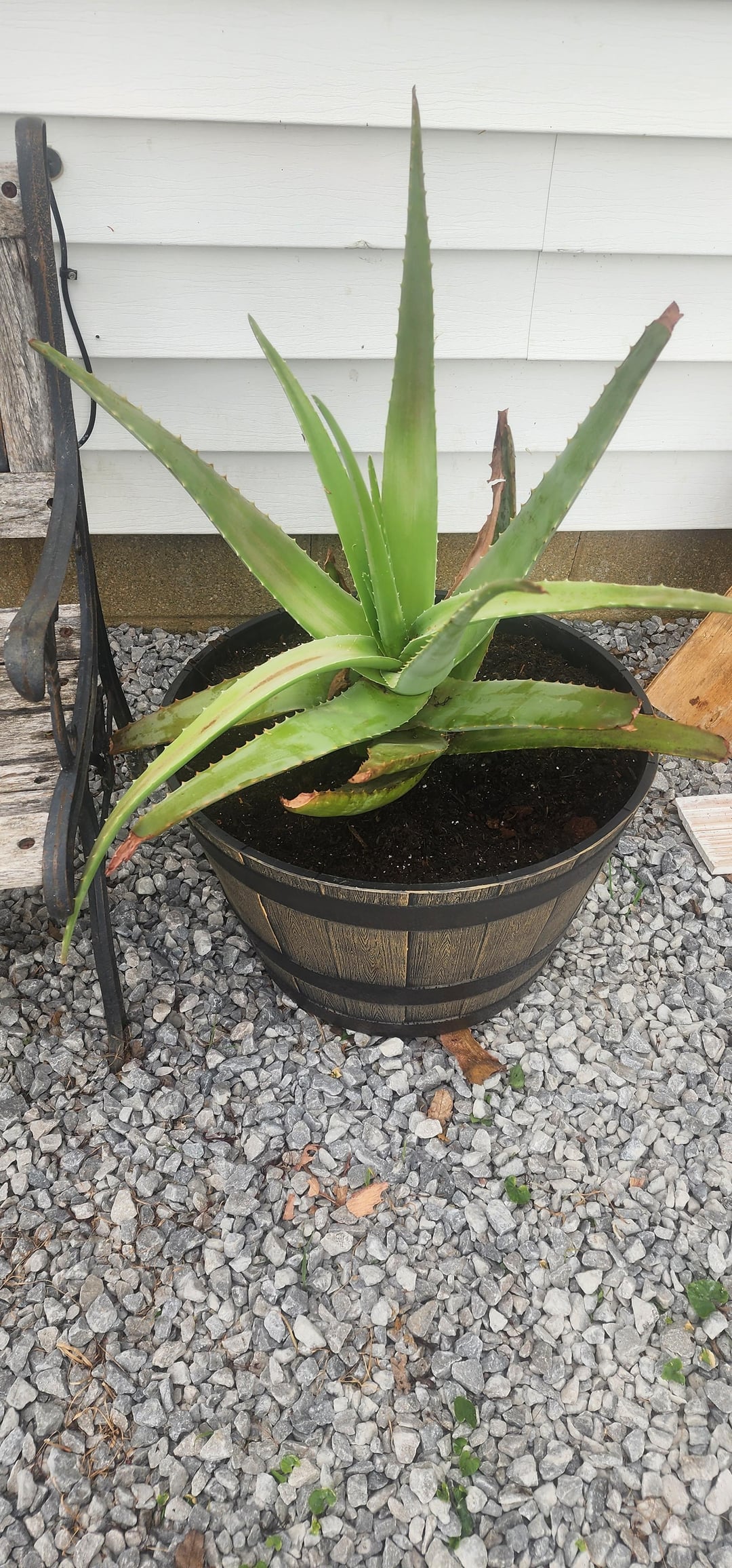 Hallo Leute! Das ist Steve, meine Aloe-Pflanze. Ich bin in Zone 7a, wo wir im Winter brutale Temperaturen haben und er etwa sechs Monate im Jahr drinnen leben muss. Diesen Winter hat ihn jemand im Haushalt etwas zu nah an die Heizung geschoben und einige Beine haben sich verbrannt, aber im Großen und Ganzen hat er den Winter überlebt! Gestern habe ich ihn in ein viel größeres, gemütlicheres 5-Gallonen-Fass umgepflanzt. Gibt es Ihrer Meinung nach noch etwas, das ich für ihn tun muss? Leider habe ich mir beim Umzug aus Versehen zwei Beine gebrochen 😭