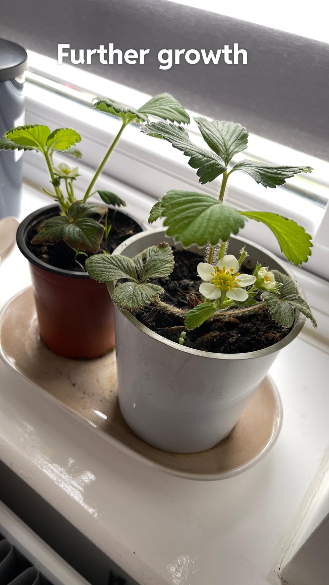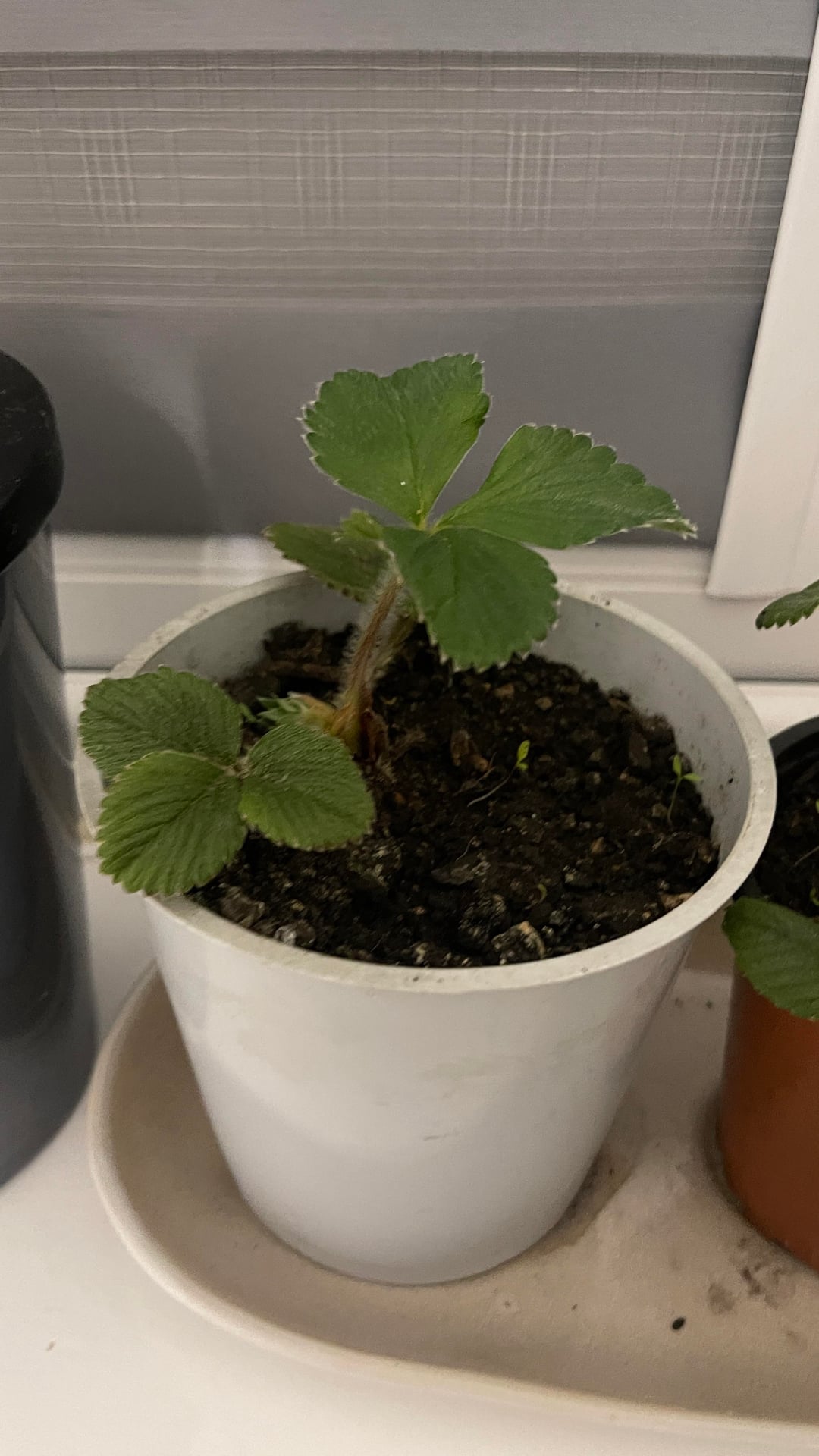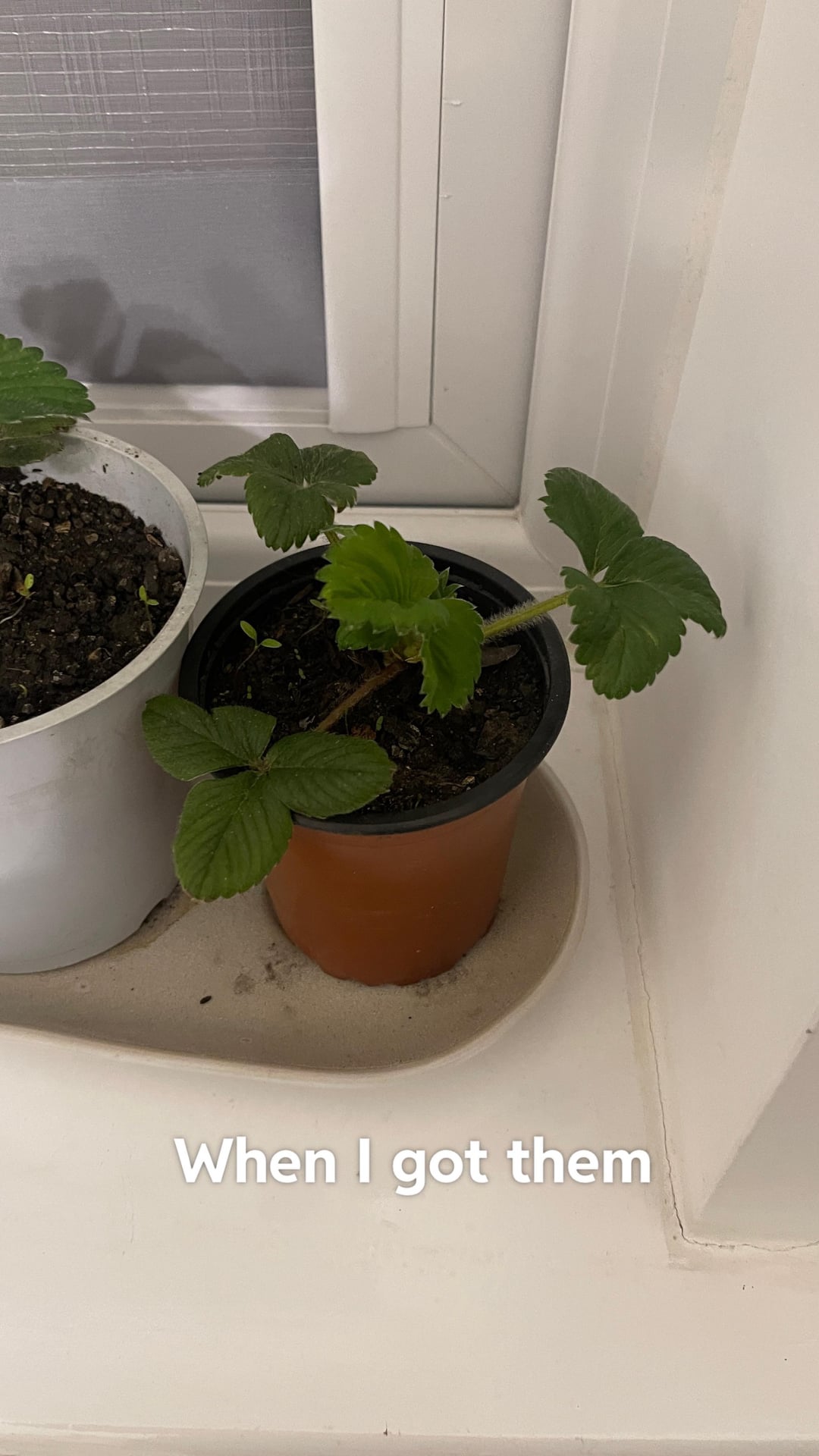Ich habe zwei Erdbeersämlinge im Kofferraum eines Autos gekauft (ich weiß also nicht, was für Erdbeeren das überhaupt sind, ups). Und sie fingen an, ein paar Blumen zu züchten, von denen ich gehört hatte, dass ich sie später abschneiden sollte, damit sie besser wachsen, also tat ich das. Die Blumen wuchsen jeden Tag, also war ich aufgeregt, dachte aber, ich sollte ihnen vielleicht mehr Platz geben. Also holte ich etwas Kompost Nr. 2 von Jon Innes und pflanzte sie in dieses Pflanzgefäß mit breitem Zaun. Wie Sie jedoch sehen können, sehen sie seitdem rau aus.