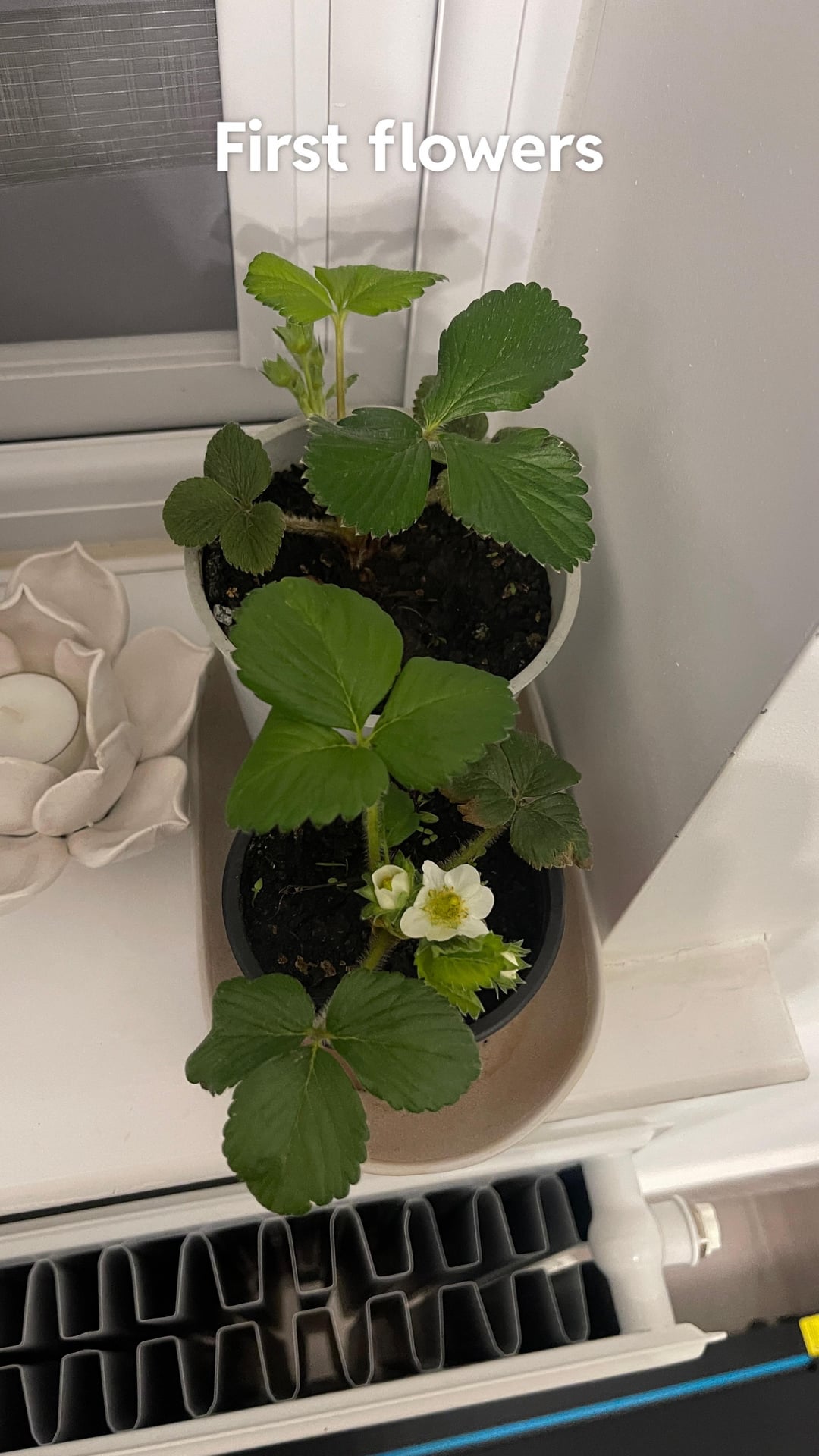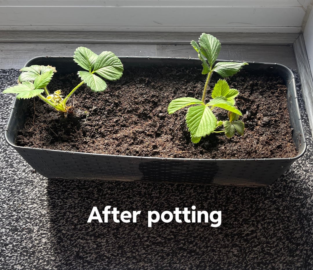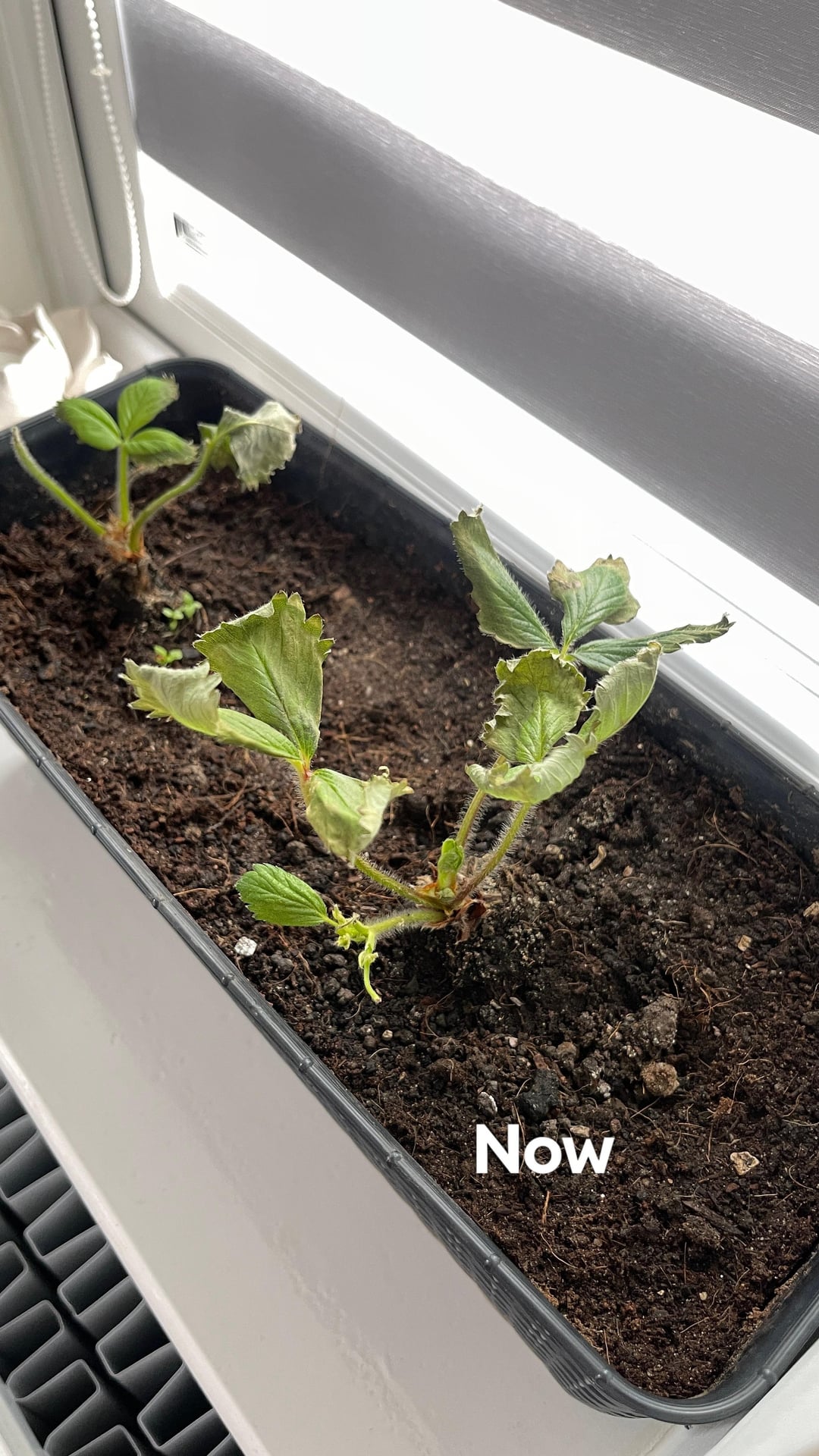 Ich habe zwei Erdbeersämlinge im Kofferraum eines Autos gekauft (ich weiß also nicht, was für Erdbeeren das überhaupt sind, ups). Und sie fingen an, ein paar Blumen zu züchten, von denen ich gehört hatte, dass ich sie später abschneiden sollte, damit sie besser wachsen, also tat ich das. Die Blumen wuchsen jeden Tag, also war ich aufgeregt, dachte aber, ich sollte ihnen vielleicht mehr Platz geben. Also holte ich etwas Kompost Nr. 2 von Jon Innes und pflanzte sie in dieses Pflanzgefäß mit breitem Zaun. Wie Sie jedoch sehen können, sehen sie seitdem rau aus.