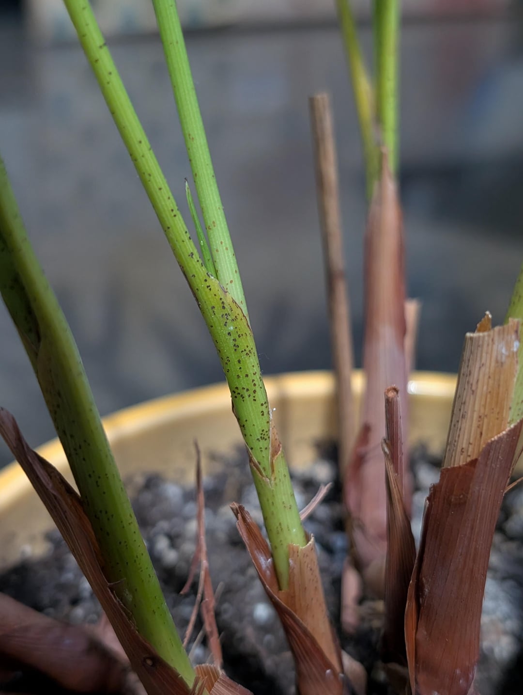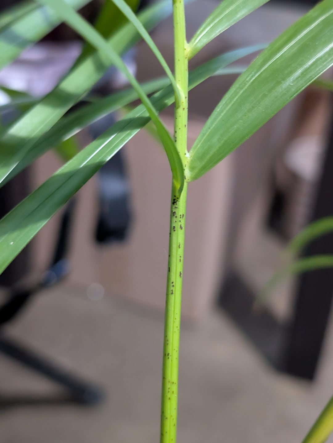 Ich habe diese Palme vor über einem Jahr geerbt und hatte Probleme mit Mehlmilbennestern und diesen schwarzen Punkten. Mittlerweile ist die Mehligkeit unter Kontrolle, aber ich entferne diese schwarzen Flecken … und sie kommen wieder … Ich kann sie ziemlich leicht mit einem Lappen abkratzen. Ich verwende auch ein Spray zum Reinigen der Blätter und zum Schutz vor Immunität sowie der Bestände.