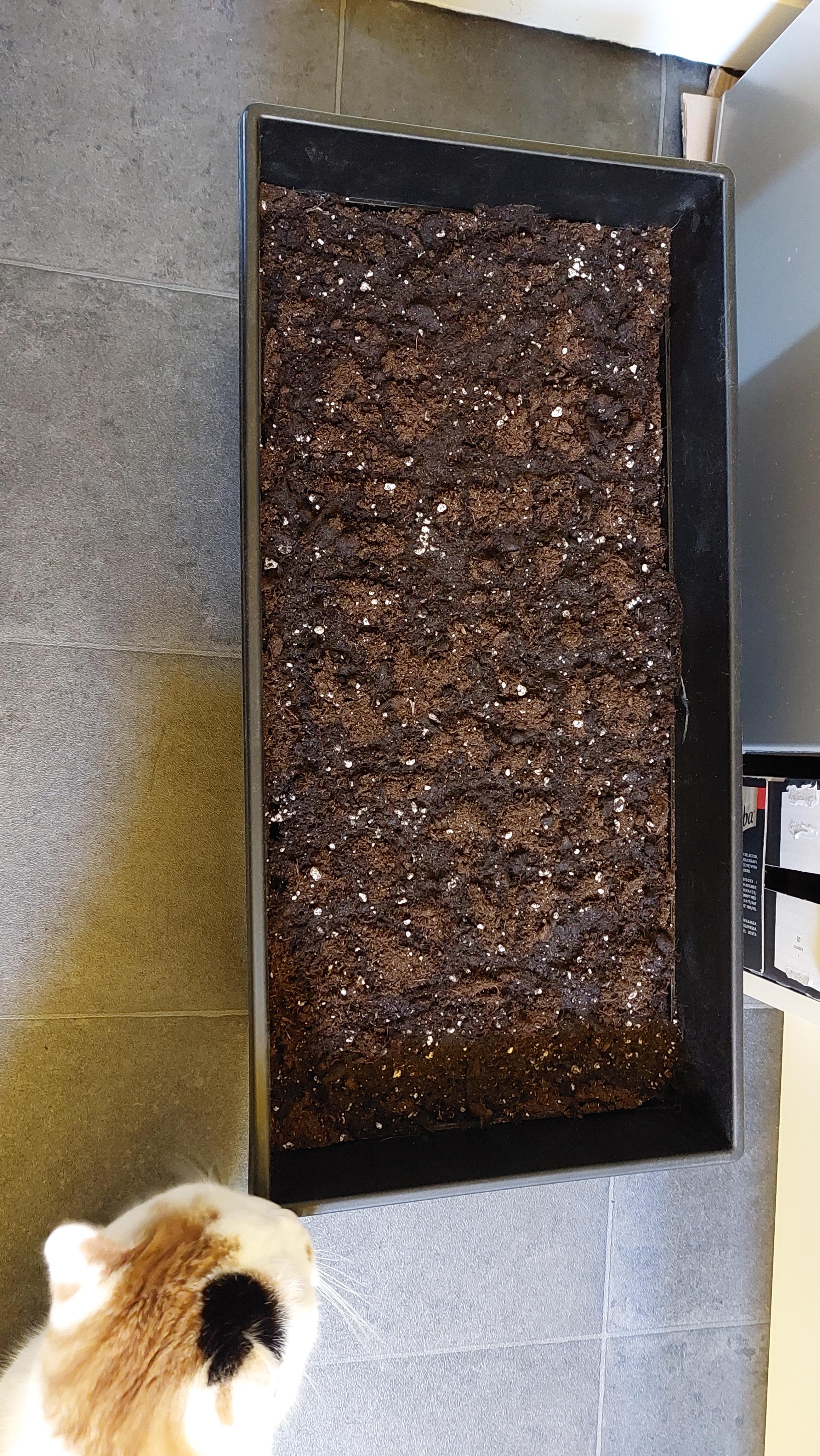 Ich lebe in einer Wohnung und habe beschlossen, einige Pflanzen für meine Katzen anzubauen. In diesen Trog habe ich den gesamten Inhalt – 400 Samen pro Packung – an Gänseblümchen, Wildblumen und Katzenminze gegeben. Aufgrund der Überfüllung bezweifle ich, dass irgendetwas lange überleben wird.