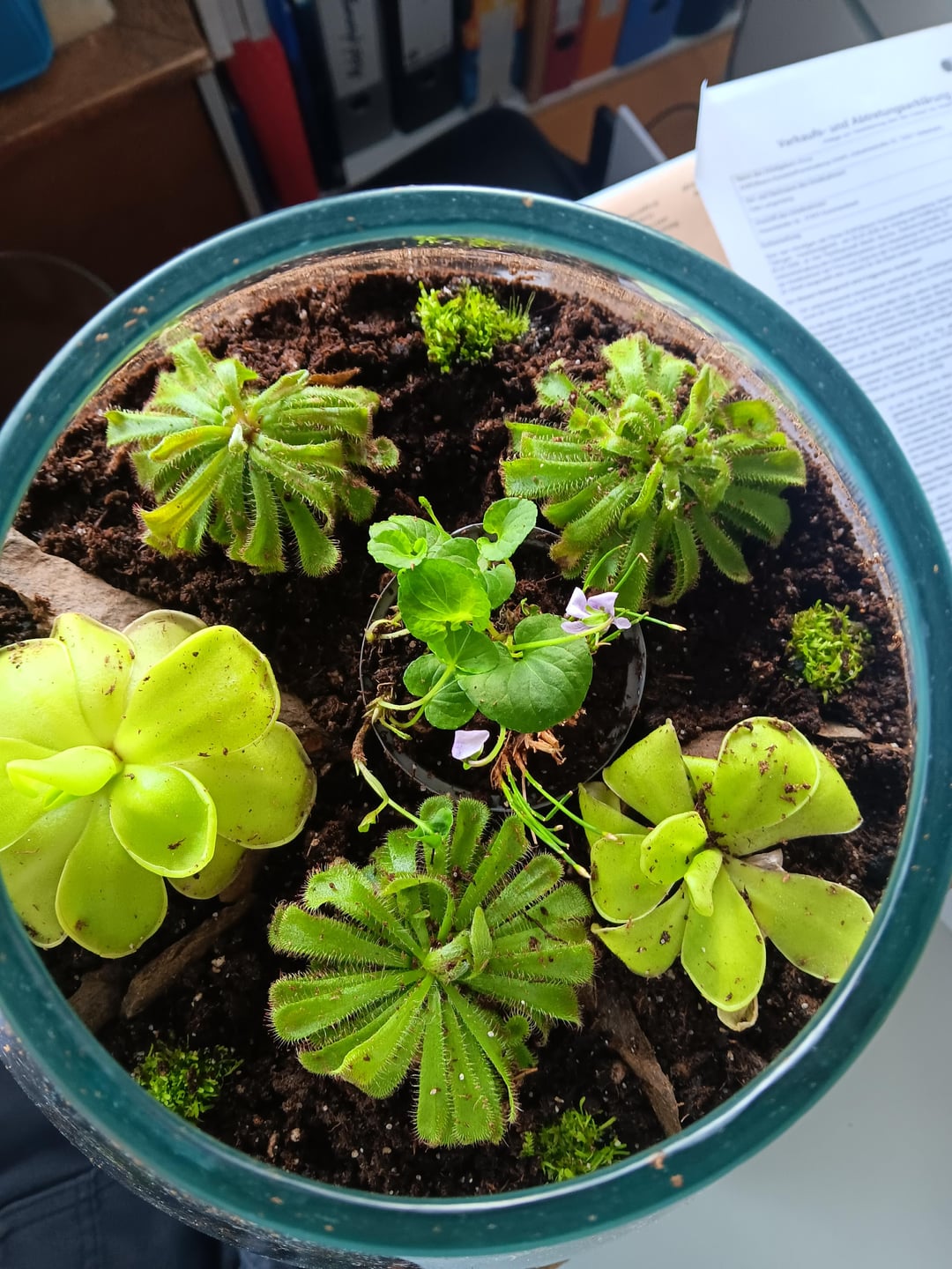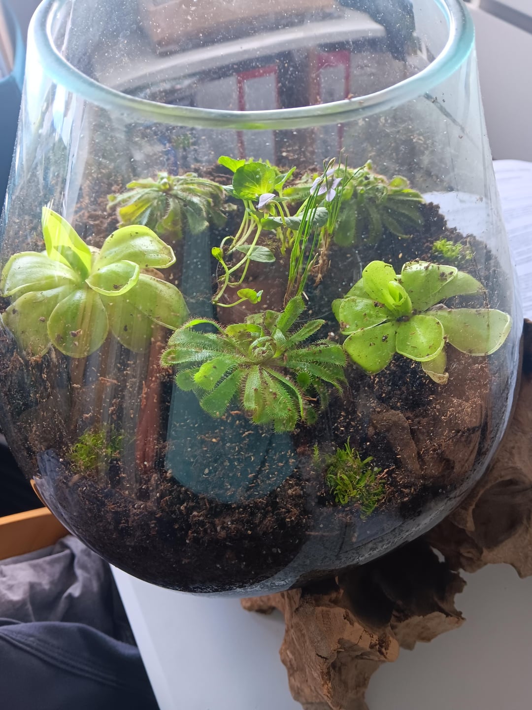 Ich habe drauf geachtet, dass die Fettkräuter auf einem Podest stehen und an Stellen, wo das Glas eine geringe Tiefe hat. Die Sonnentau sind an den tiefsten Stellen.