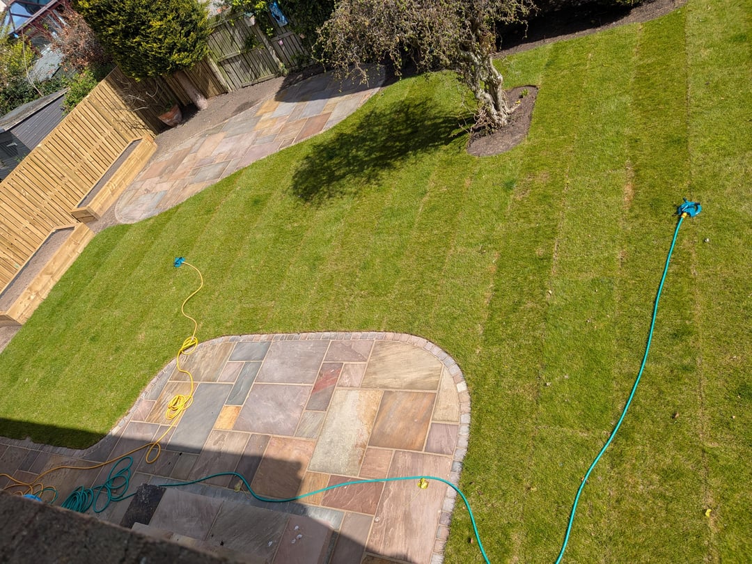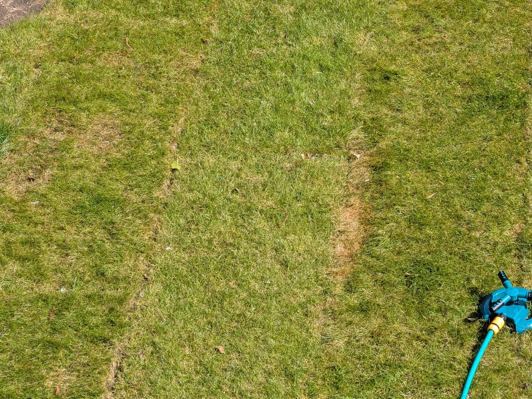 Der Rasen wurde vor ca. 10 Tagen installiert. Wie angewiesen, haben wir zweimal täglich jeweils eine Stunde lang gegossen. Und ansonsten gut in Ruhe lassen (z. B. nicht darauf laufen). Einige Abschnitte (siehe Foto 3) scheinen zu vergilben/nicht zu wachsen.