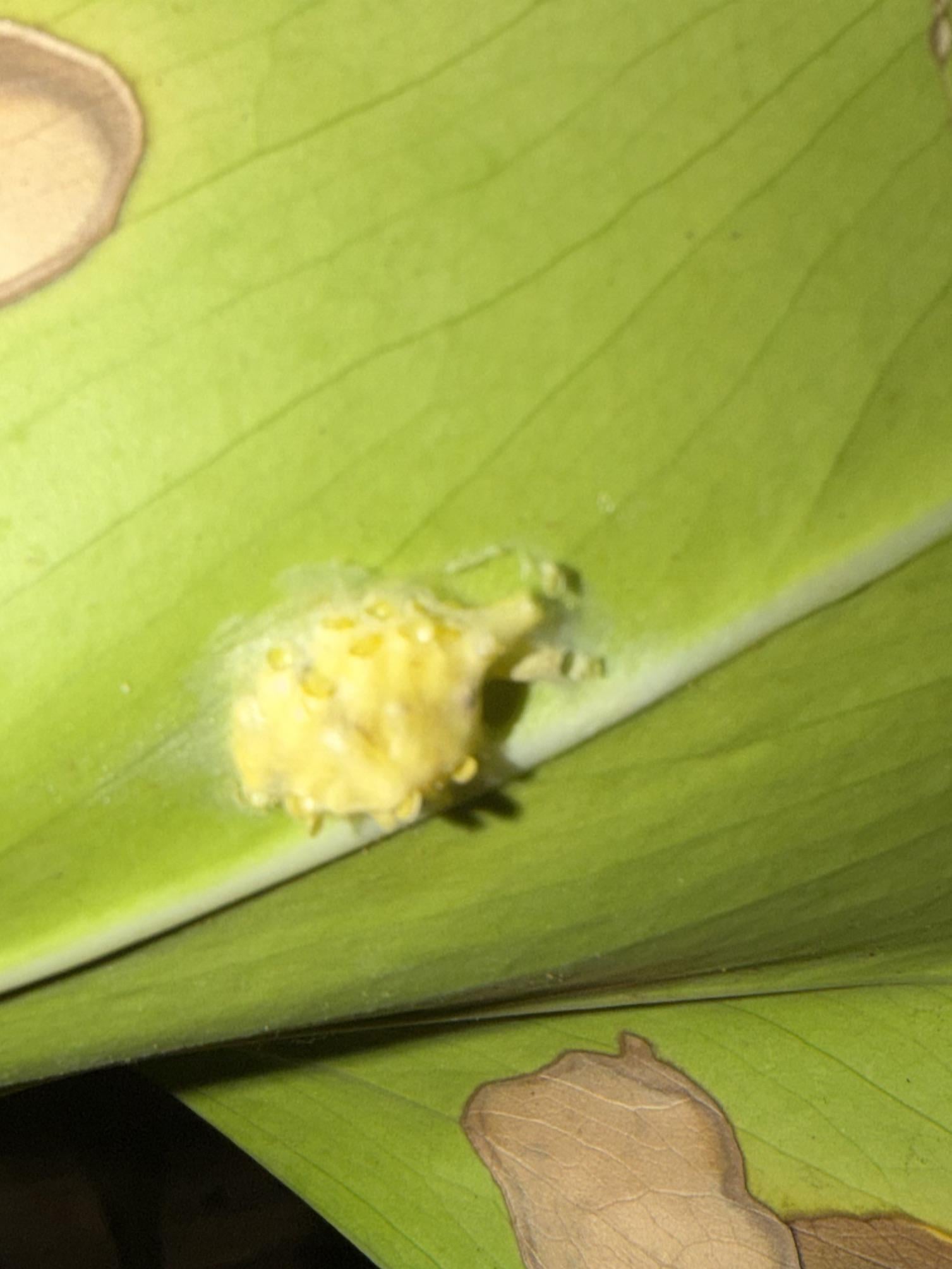 Stellen Sie dies sofort nach draußen. Es fühlt sich verkrustet an, vielleicht eine Art Wespennest? Es ist ein Ausschnitt aus der Monstera eines Familienmitglieds im Freien.